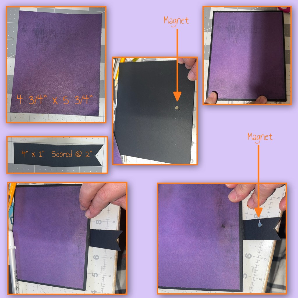 Soooo, while playing with the magnets I slightly ripped the paper so I needed to make a border to cover the hole. My magnets are not super strong so I needed to make sure I only had paper over the magnet and not cardstock because i was pretty sure the magnets wouldn’t hold through cardstock. So I cut 2 skinny strips of orange and a thicker piece of patterned paper. The combined dimensions are below. Add the border and I cut a piece of purple to add to the inside of the band to cover the magnet.