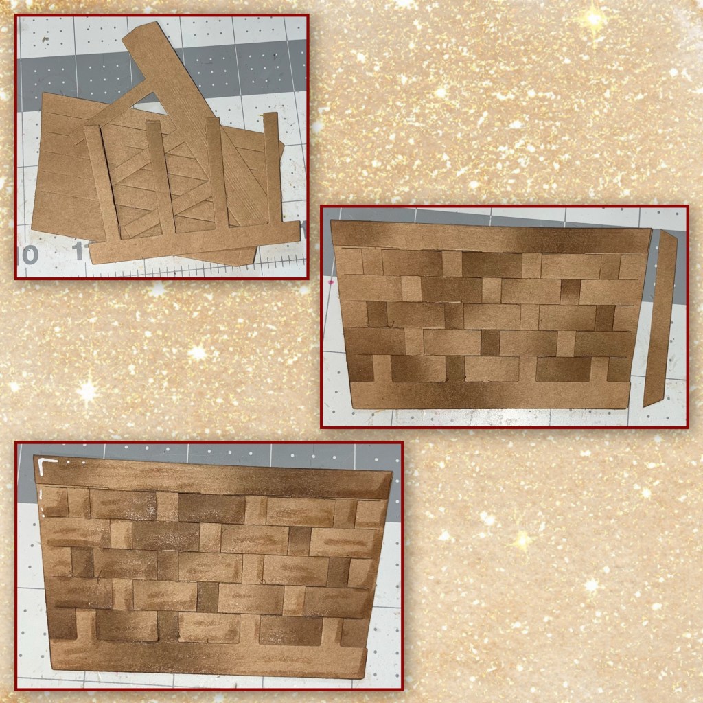I cut the pieces from the Wide Woven Basket, I only needed one set as I am adding them flat to the card as apposed to making them into a 4 sided basket. I used a brush and ink to add shading to the pieces BEFORE I weaved them together. I cut the tab off the right side off as it also won’t be needed. I used Versa Mark marker to add lines to give it some detail and a few white highlights.