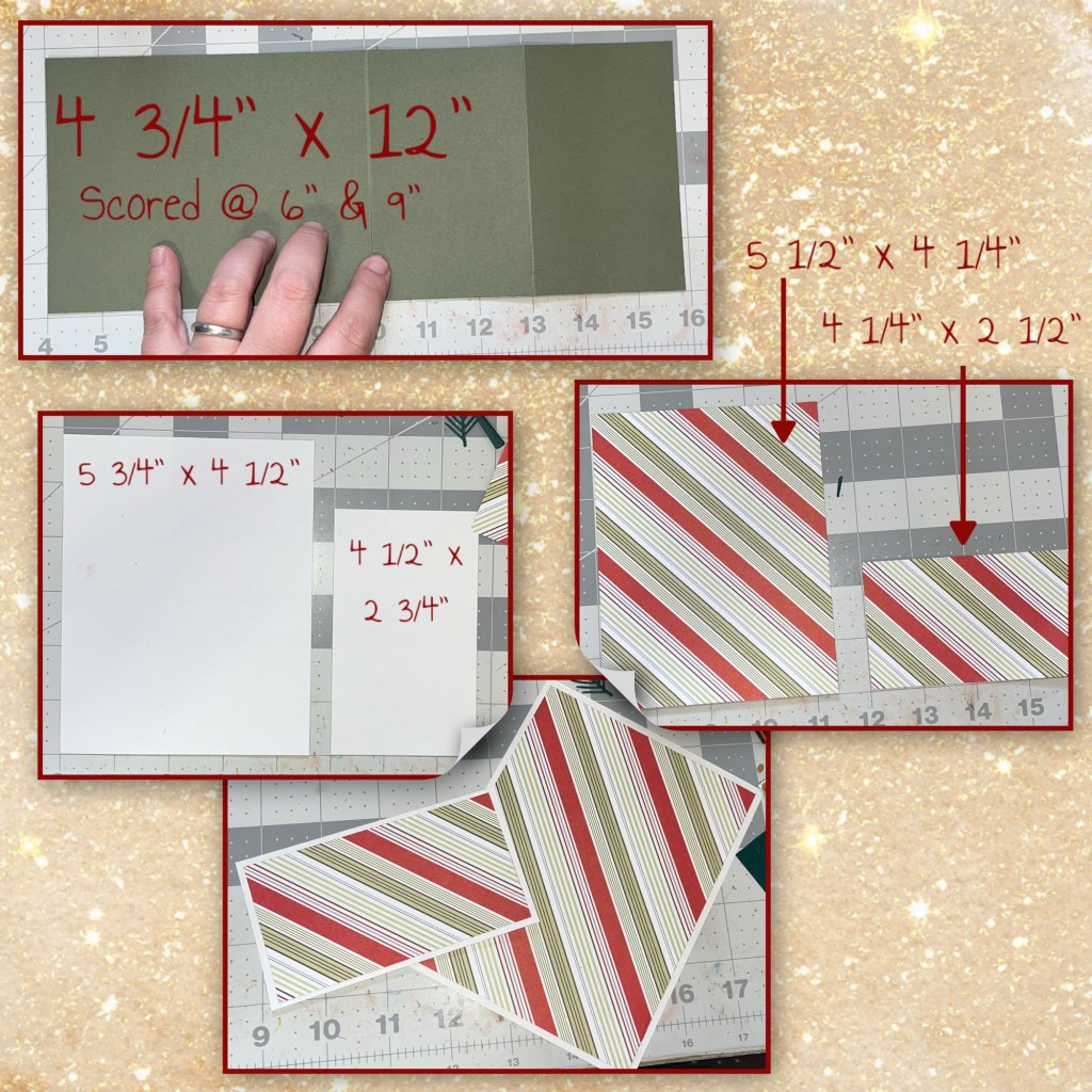 So typically with an easel card there is raised piece on the inside that will help hold the card in position when opened. I wanted to use one of the new labels but because of the shape of the label it wasn’t really holding it open, and I would still need a place to sign so I decided to add an extra flap that would fold down from the bottom. So I cut the pieces as shown below. The piece with the stripes will be visible when the flap is up (closed position) and the white side will be visible when the flap is down (open position)