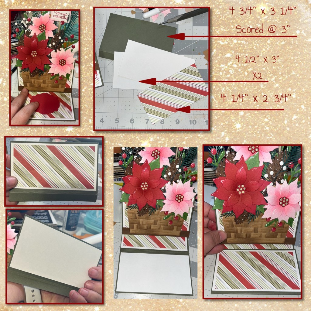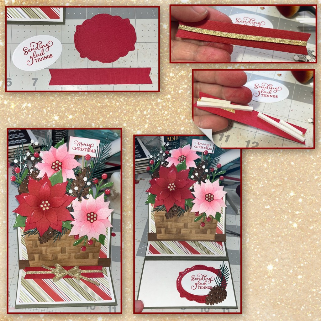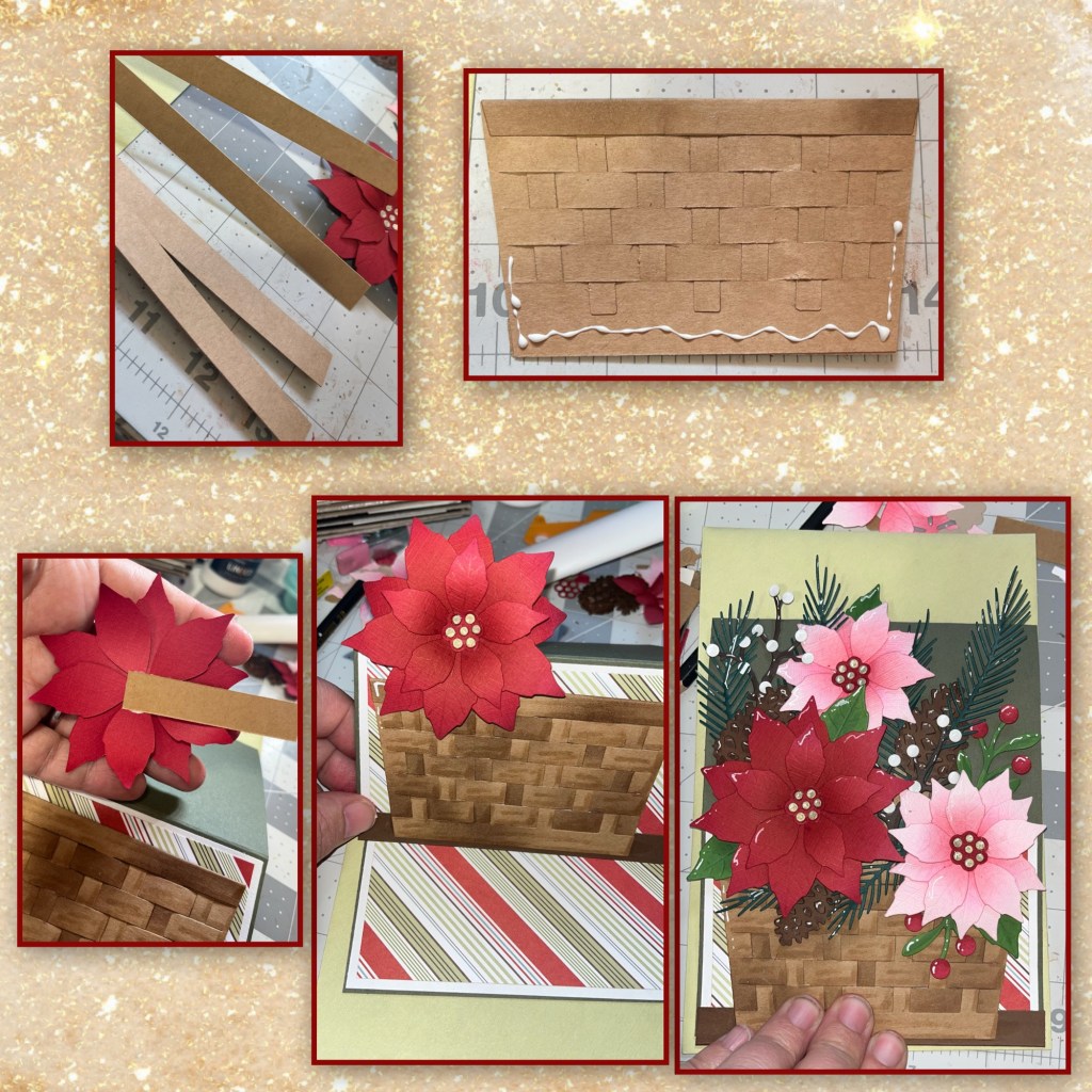 I knew I wanted to fill out my Christmas basket so I die cut the pieces from the Pine Cone set as shown, and the pieces from the Poinsettia as shown. On the pine cones, the leaves and the branches I added shading with alcohol markers. On the poinsettias I added shading with a brush and ink. I held off on adding the white highlights until I found where I was going place them. I also added some curves to the flower petals.