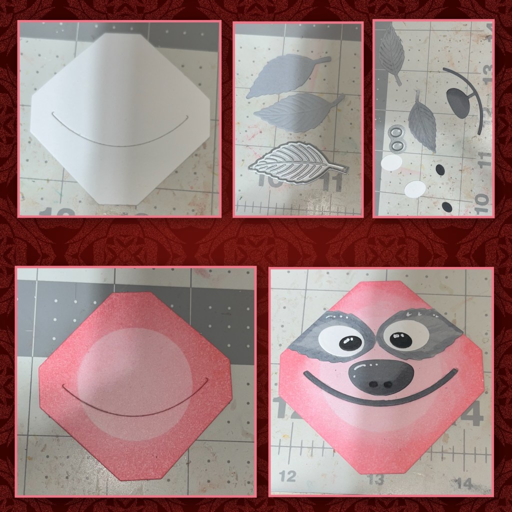 I knew what I wanted to do but I wasnβt sure if I would be able to pull it off. So I decided to start with the face. I cut the top piece from Playful Pop up for the face, and the two large leaves are from the same set. The eyes, nose and mouth are from the Cat and Dog Playful Add ons. I used a a brush to add on the pink ink. I started by having a circle mask in the middle, to have the outside darker than the inside, then I inked the inside. I trimmed off the little piece from the mouth/nose piece. I used a grey alcohol marker to add shading and a white gelly roll pen to add highlights. To give her the βslothyβ features I wanted the nose to be closer to the mouth and I added the eyes sideways. Looks like a sloth to me so I continued with the card.