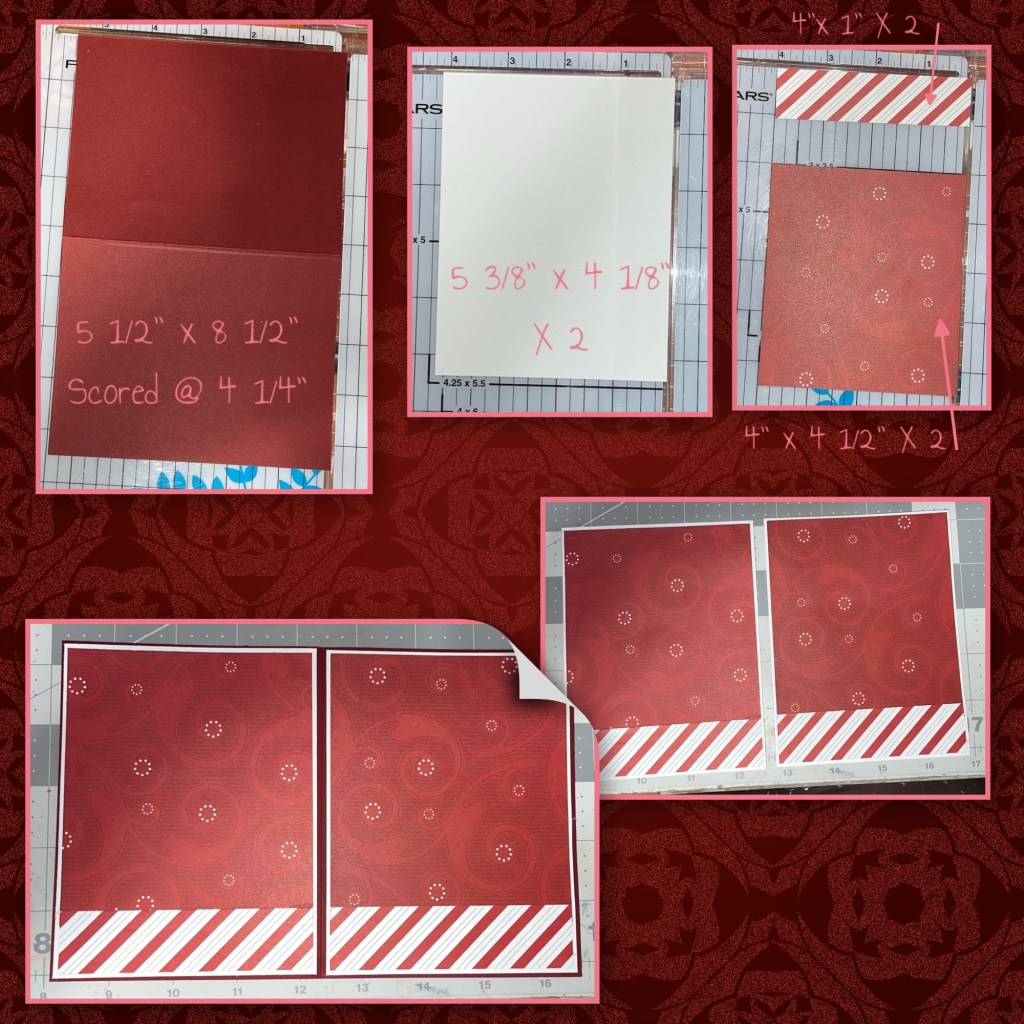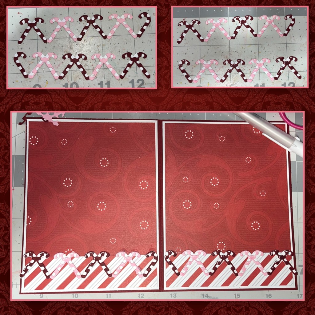 I wanted to add borders to cover where the 2 patterned papers meet so I cut out the candy cane borders from Christmas Borders 2 from pink and red and added as shown.