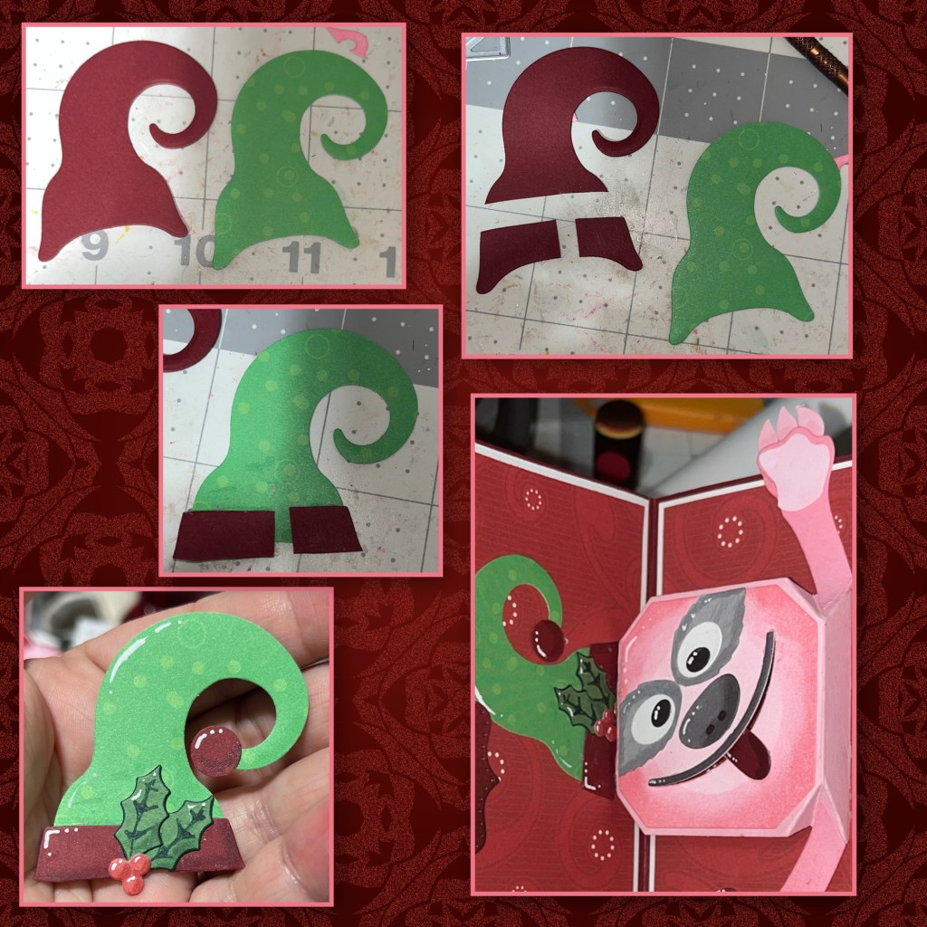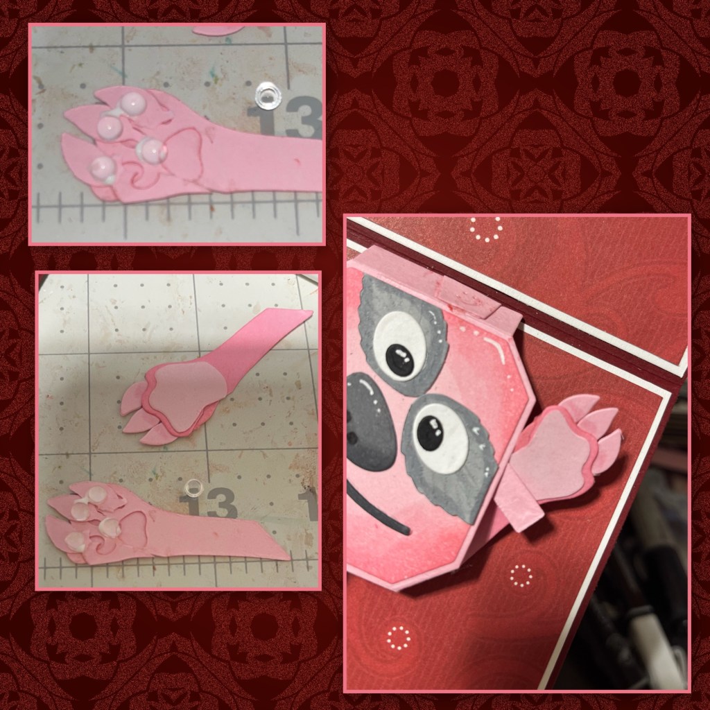 Because I figure things out as I go I didnβt think about the paws caching on the borders. So on the bottom hand/paw I decided to add a couple of 1/2 bubbles to the back of the paw so when I open and close the card the bubbles will glide over the border without catching. For the upper arm I decided to cut it off. He doesnβt have an ear and I thought about attaching the hat but it would have been too sideways so I decided against it.