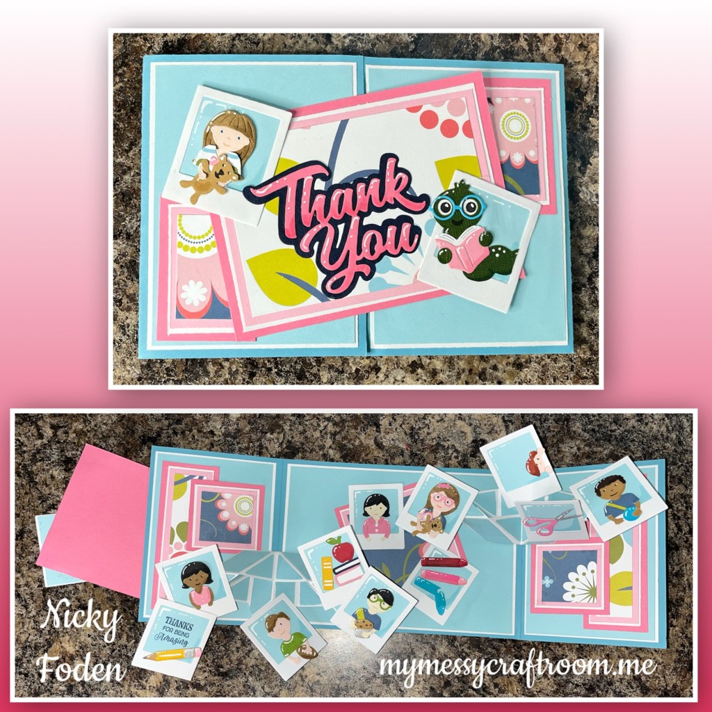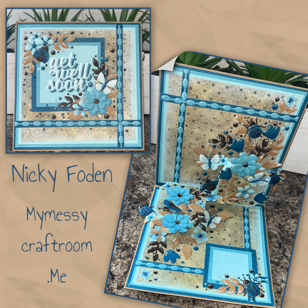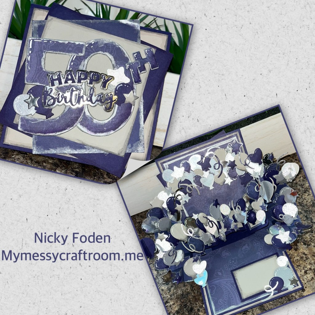 This is a special milestone birthday card that I made for my husband. The photo does not do this card justice the silver is so shiny and there’s so much depth to the pop up with its multiple mechanisms.