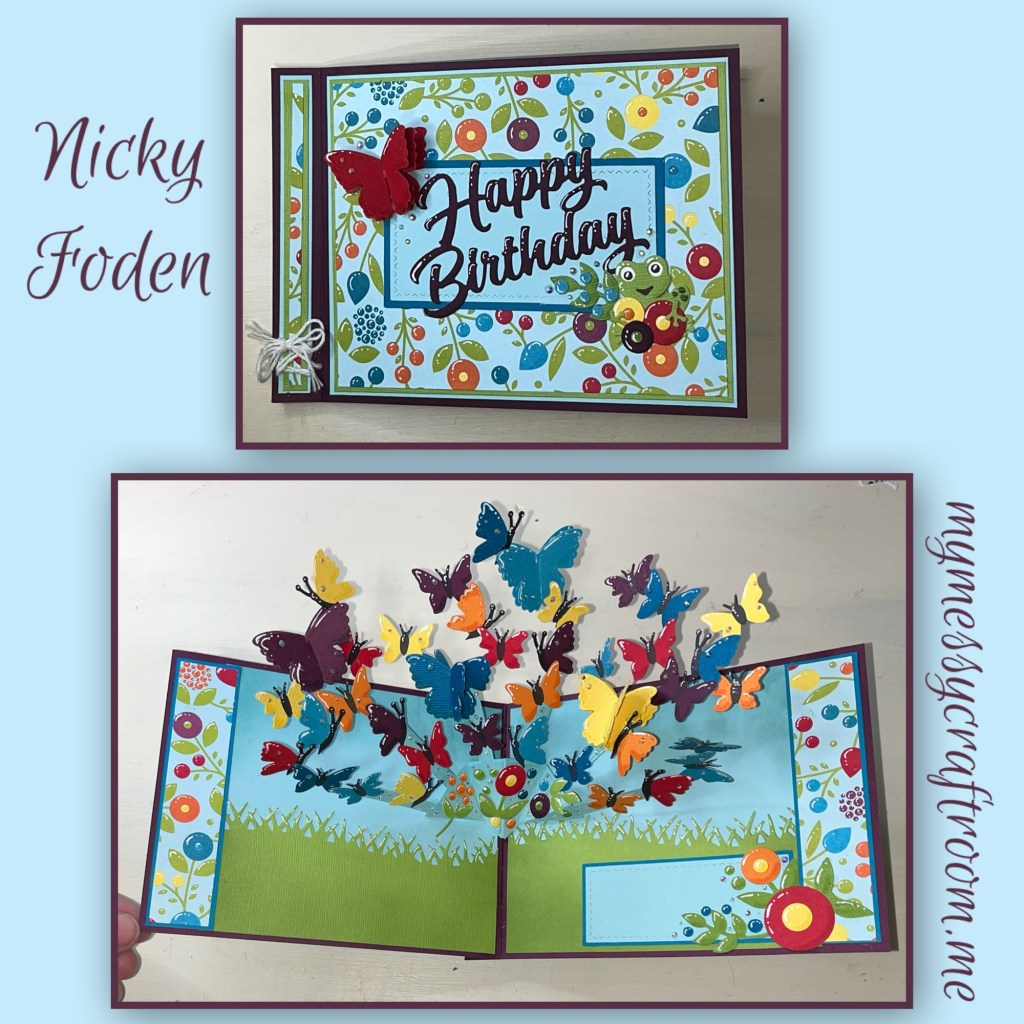 I think this card is so pretty. It was inspired by that week’s episode of Craft Roulette. I really need to start playing again as I have made some really pretty cards. Again I used the patterned paper to choose the colour palette which is really vibrant. I really love how the butterflies look like they are flying right out of the card.
