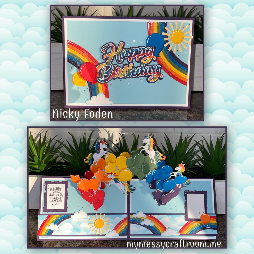 I really like bright and vibrant cards. I love all the rainbows and the balloon arch with the rainbow colours. The unicorns just add such a magical touch. Believe it or not I still have this card put away for a special little girl. I had already mailed her a card when I received these super cute unicorns, so I made her card for next year lol.