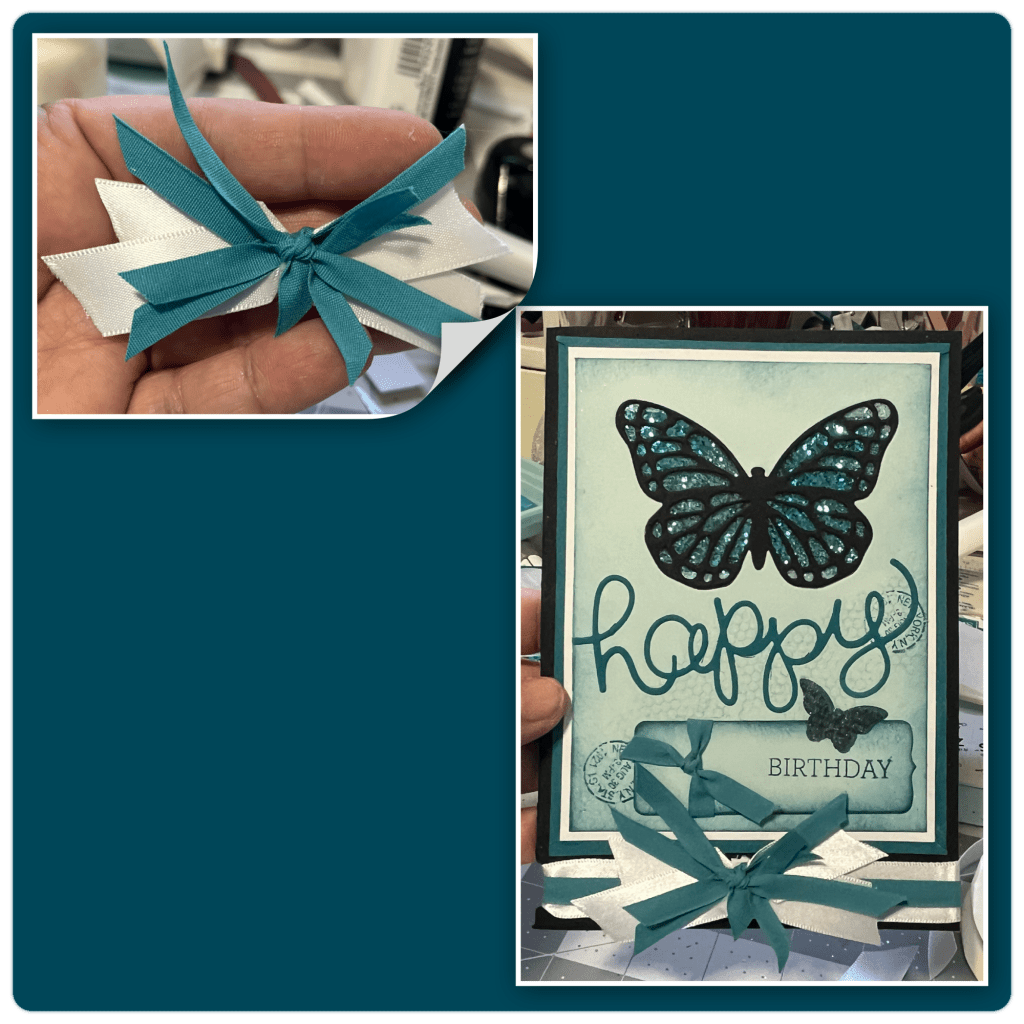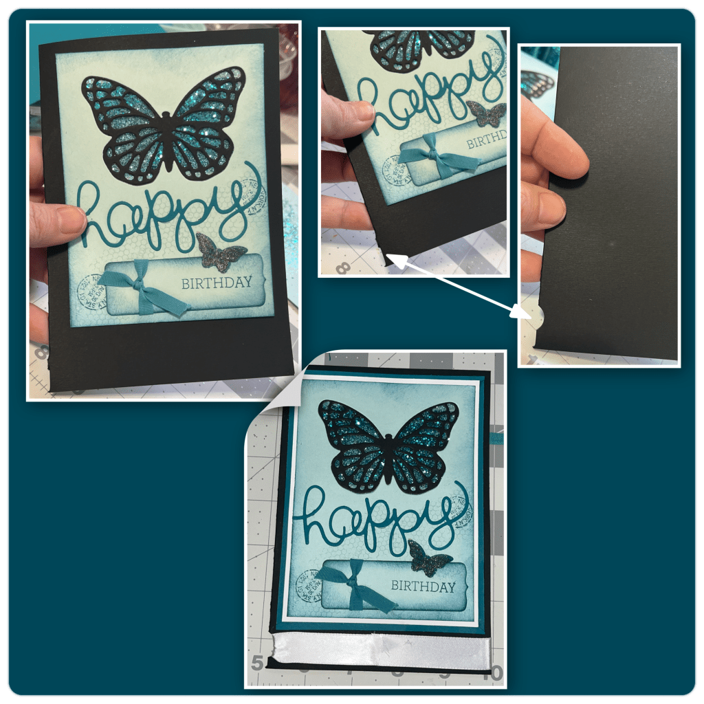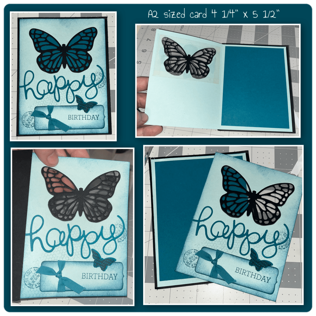 I thought I was quite clever when I made this card. The Black Butterfly is actually adhered to a piece of acetate which makes the butterfly appear to be the darker blue that is the colour on the inside panel. The finished card was 4 1/4” x 5 1/2” with the black panel being the finish size, the card part that opened was about 1/4” smaller. I cut the front flap of the card off and it will be used on the new card. All the supplies I used for the original card are retired Stampin Up! And at the time I mixed die cutting and stamps to give a collage kind of look.