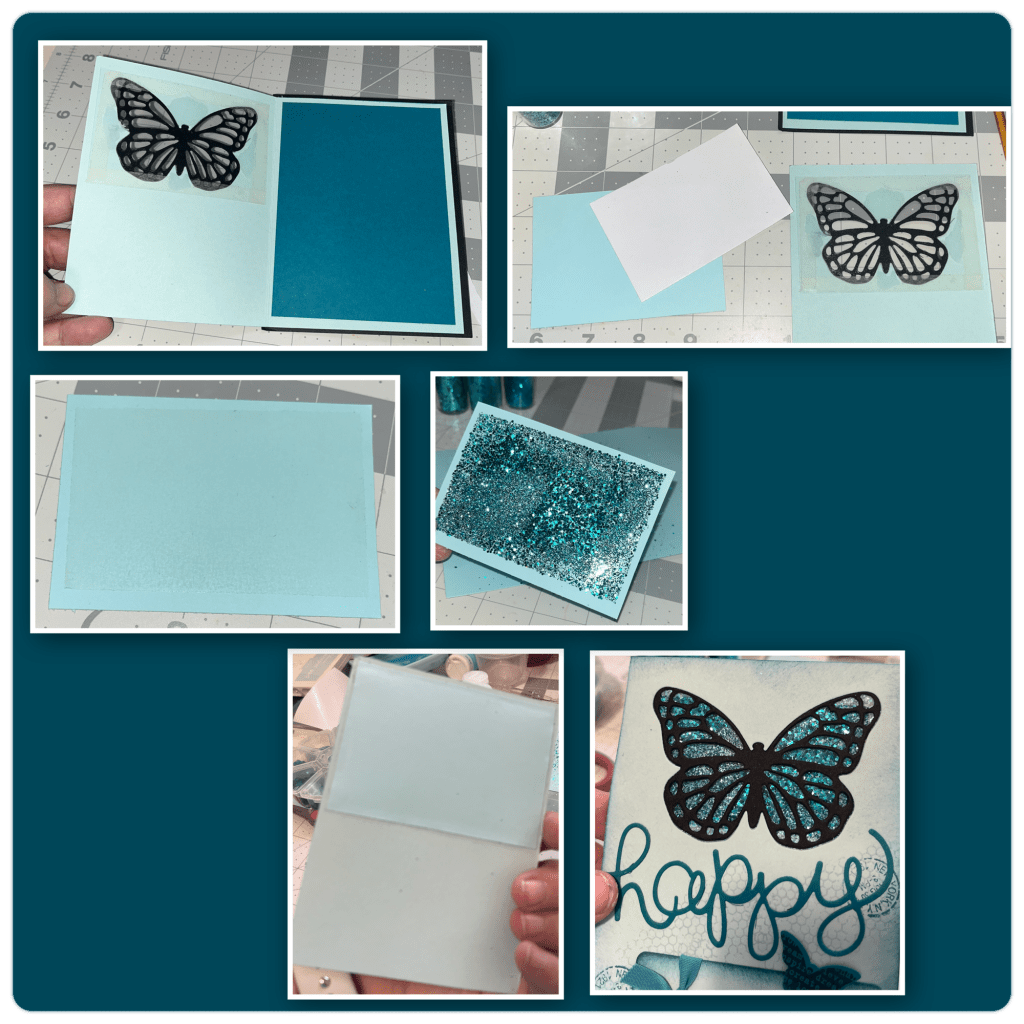 Ooops I added a duplicate photo. I knew I wanted the butterfly to still be teal so I took a piece of cardstock slightly bigger than the butterfly and added a piece of double sided adhesive. I took 2 different teal glitters, one a little chunkier than the other and stuck it to the adhesive. I added the glitter cardstock behind the butterfly. It gives the impression of a shaker box with it being a shaker