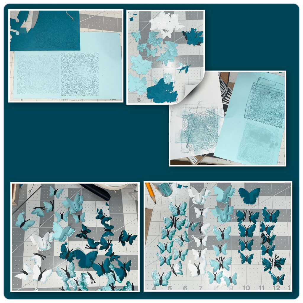 I wanted there to be a bit of interest to some of the butter flies so I used an old Stampin Up! Stamp and stamped differed shades of blue onto the cardstock as shown below. I used white, a lighter blue and a darker blue, some I stamped on and some I didn’t. I diecut the butter flies from the Butterfly Collage Addon, then I coloured with alcohol markers, and highlighted with a white Gelly Roll Pen. It’s hard to see but I also added a little bit of Wink of Stella glitter.