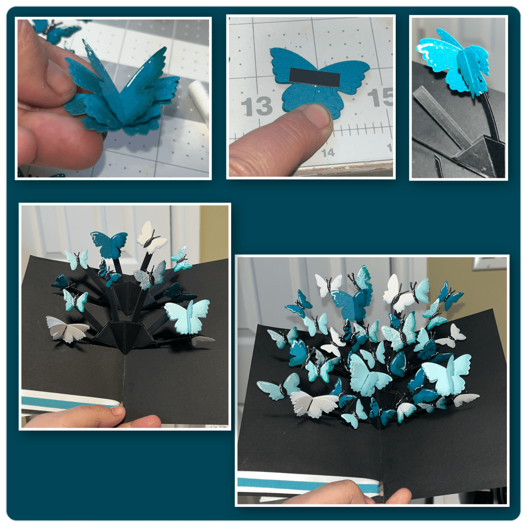 I like to add an extra layer to the flapping butterflies but I still like them to have a bit of control so I add a small strip of paper to the back, they still have dimension but they don’t flipped to far back when opening and closing the card. I started adding to the arms and then I started filling in the spaces. Opening and closing the card between each new butterfly to make sure they don’t catch on each other.
