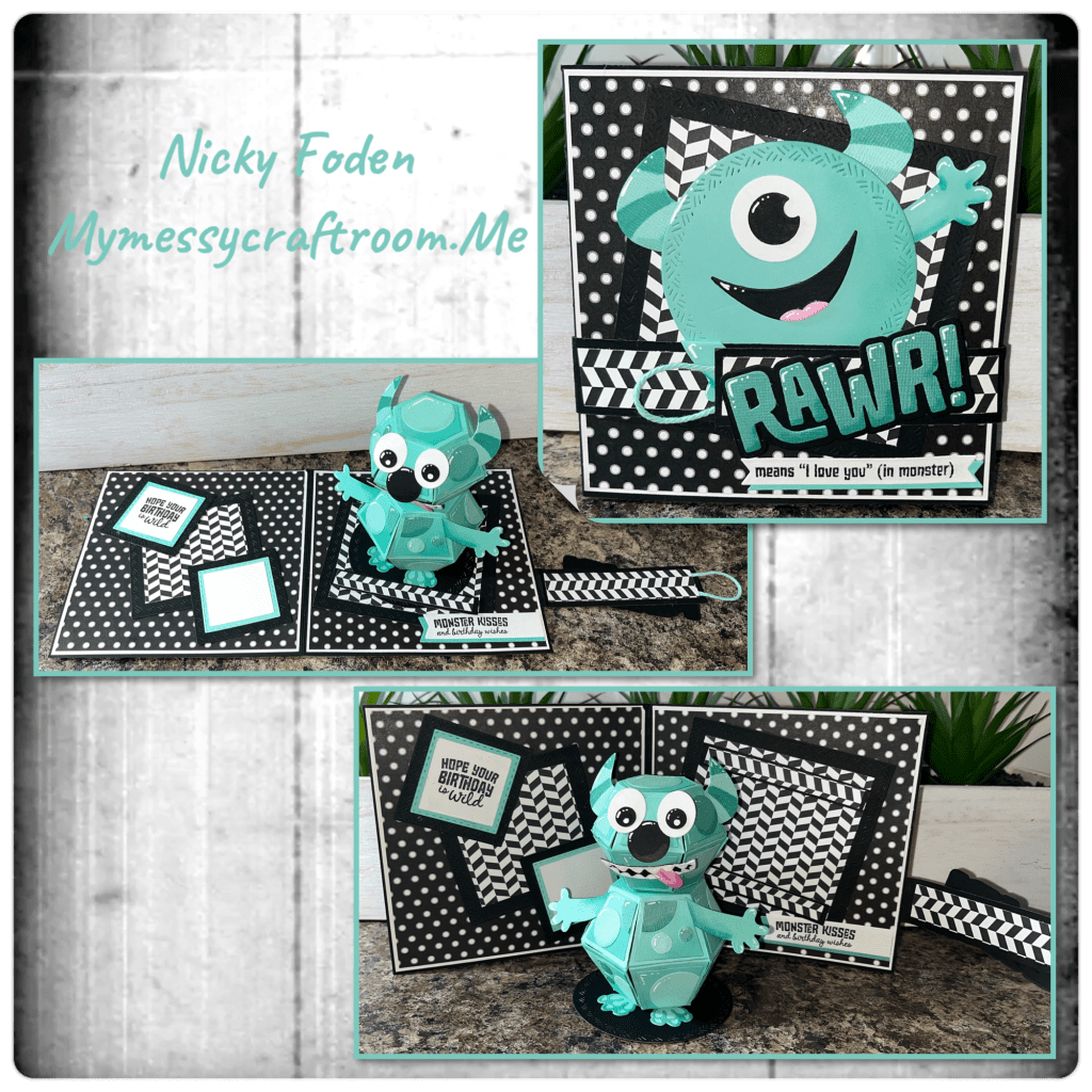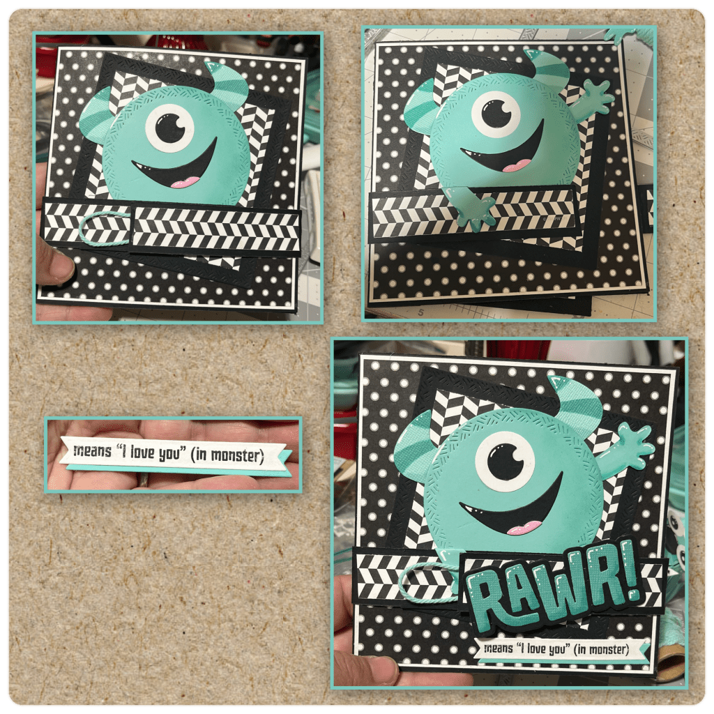 I added the monster arms as shown. The stamps are from the Monsters Sayings and I diecut the banner from the Greeting Labels as shown. I added the greeting and Rawr as shown.