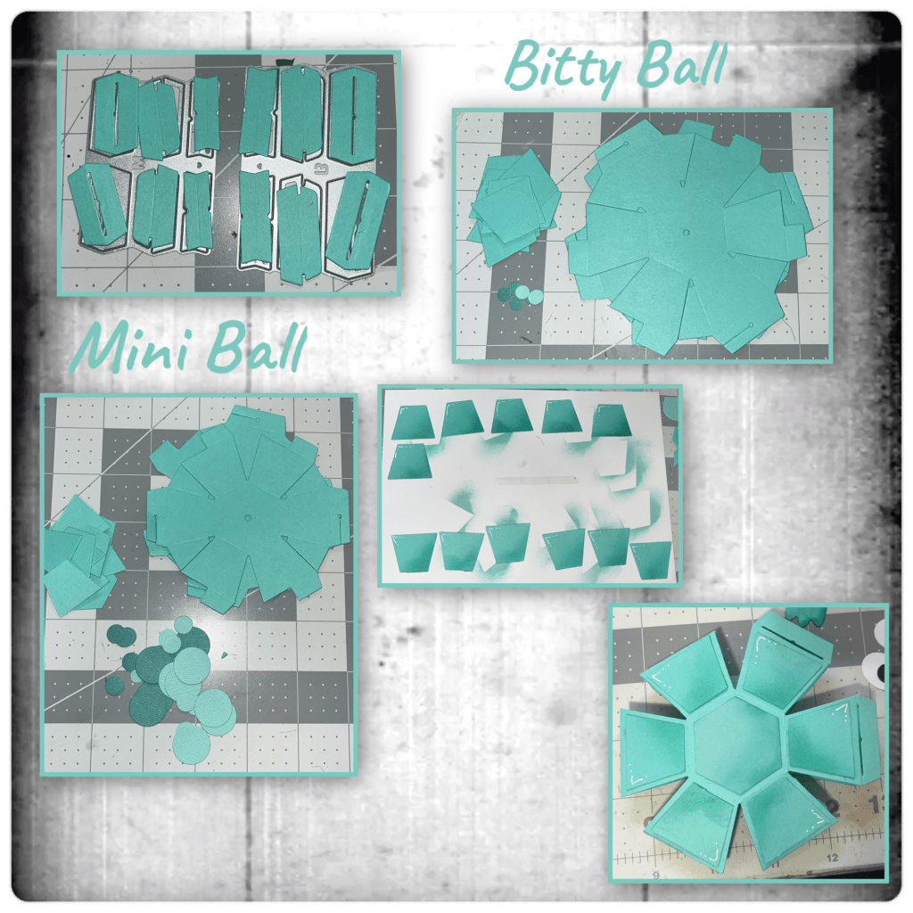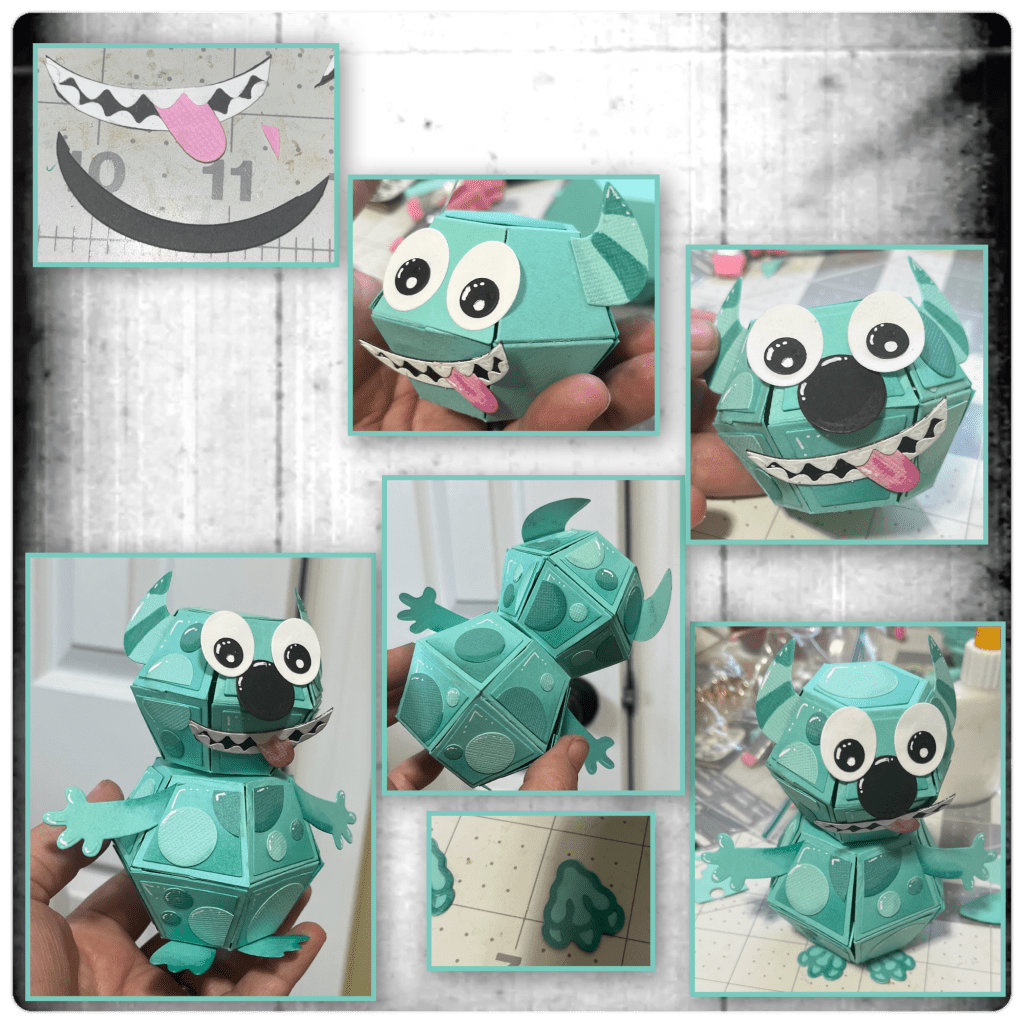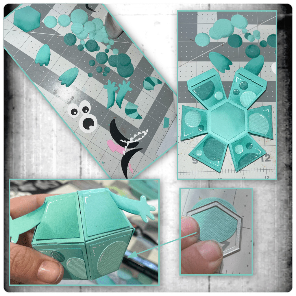I diecut the pieces from the Monsters Playful Add on. I coloured them and the dots with alcohol markers, and highlighted with a white Gelly Roll Pen. I started adding to the balls. Use the trapezoid dies to cut the circles to fit some of the different corners.