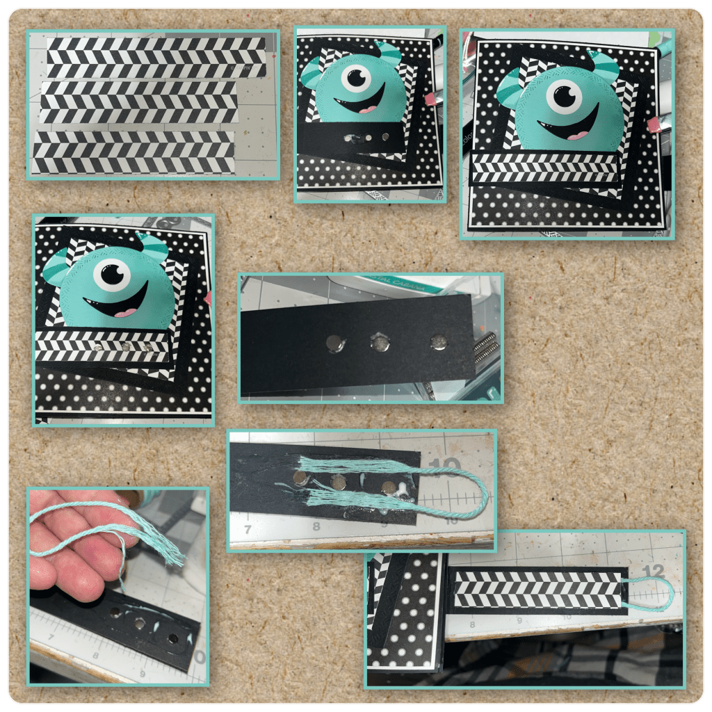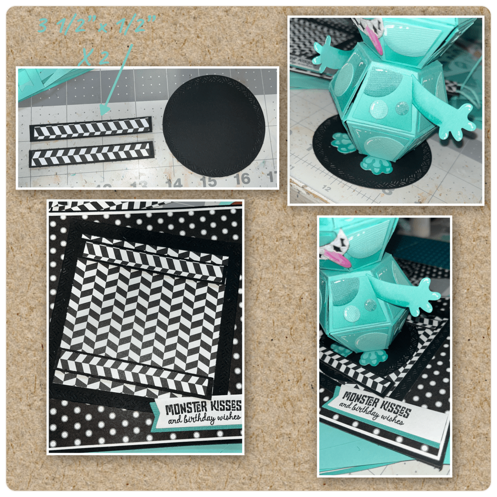 I decided that I didnβt want the monster to just fly out when opening the card so I added him to a Circles crosshatch. I cut the strips as shown below and added to the right side square as shown. You want them close enough that when the circle slide in it just wonβt fall out. But far enough that you can slide one end of the circle in and still be able to slip in the other side of the circle.