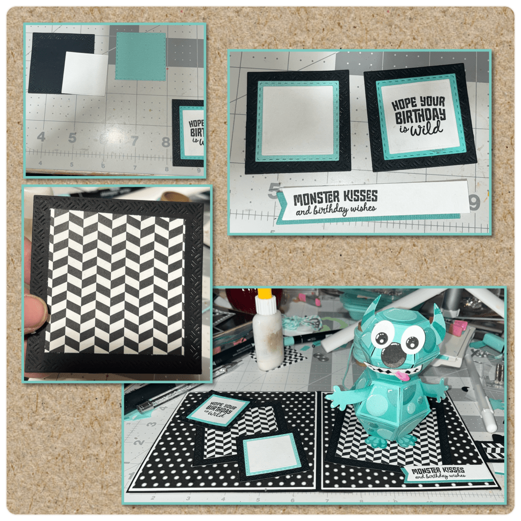 Now itβs time for the card base. I decide that I wanted the colour of the monster to pop against the card base so I was going for a black and white base. I cut the card base and the panels as shown below.