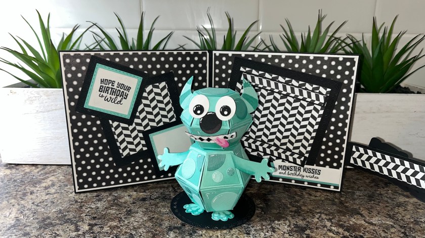 Using the Squares Crosshatch I cut a black panel and a patterned label, Using the Circles Crosshatch I made the face for the monster and used the Monsters Playful Add ons for the rest of the face. I forget the dimensions of the wrap but it wraps around the whole card and over laps by a couple of inches. After adding the squares and the monster I adhered the band to the back and to the left side.