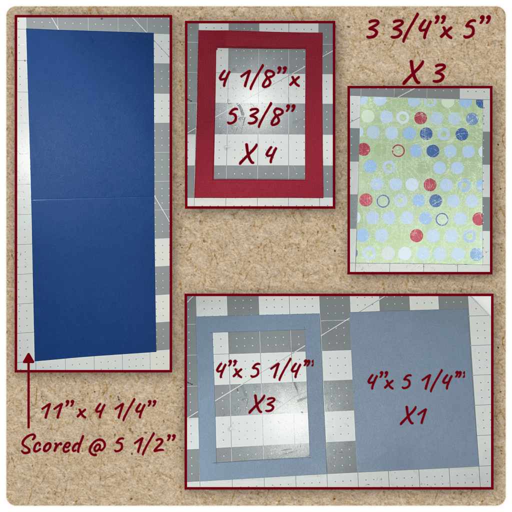 I made this into a 5 1/2” x 4 1/4” top fold card. I cut the panels as shown below. I cut the centers out of the ones shown to conserve cardstock and lesson the bulk.