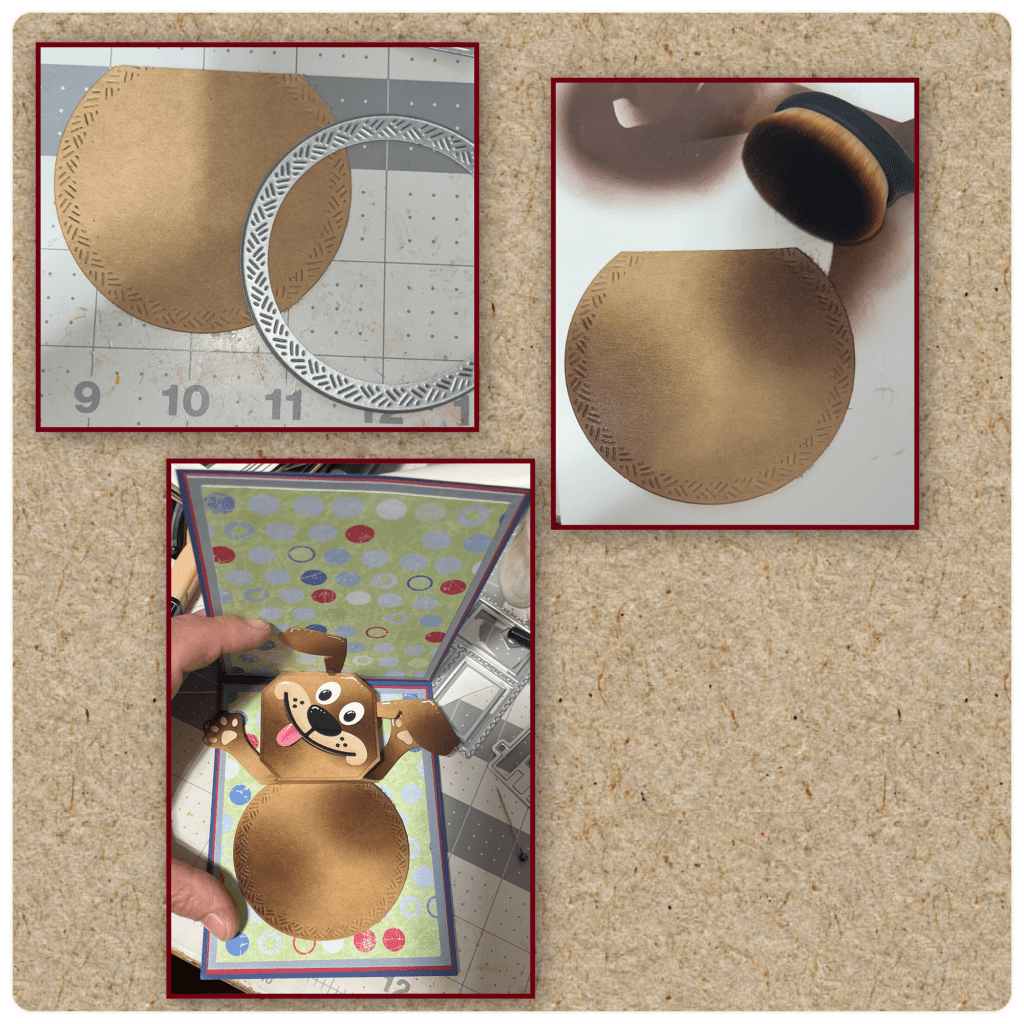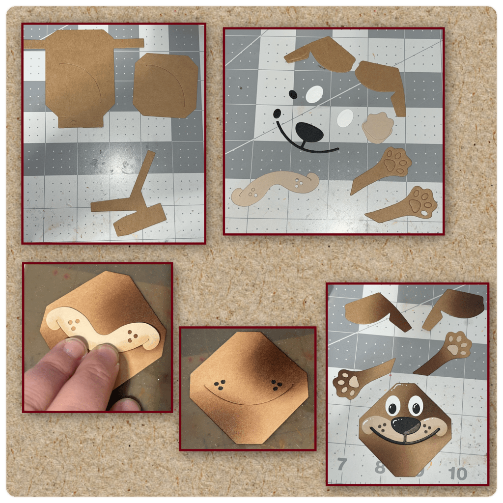 I cut the pieces of the Playful Pop Up and the pieces of the Dog and Cat playful Add on as shown. I wanted to add some texture to the dog so I brushed on a darker ink as shown, then assembled the face and paws. I highlighted with a white Gelly Roll pen.