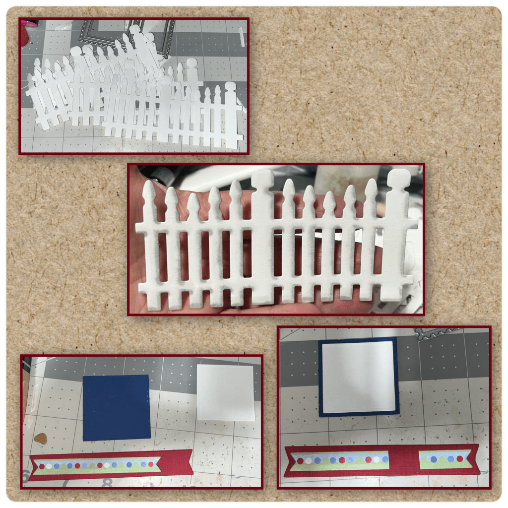 I thought that it would be cute to have it look like he was behind the fence. So I cut 4 Fence Add On pieces. I glued them on top of each other to make it a little sturdier. I added shading with a grey alcohol marker. I wanted a fun border along the bottom so I cut the two Banner borders from the Greetings Labels. The stitched square is also from the Greeting Labels and the smaller square is from the Postage Pop up. The smaller banner is quite a bit smaller so I cut and assembled as shown because I am going to cover the gap with the square.