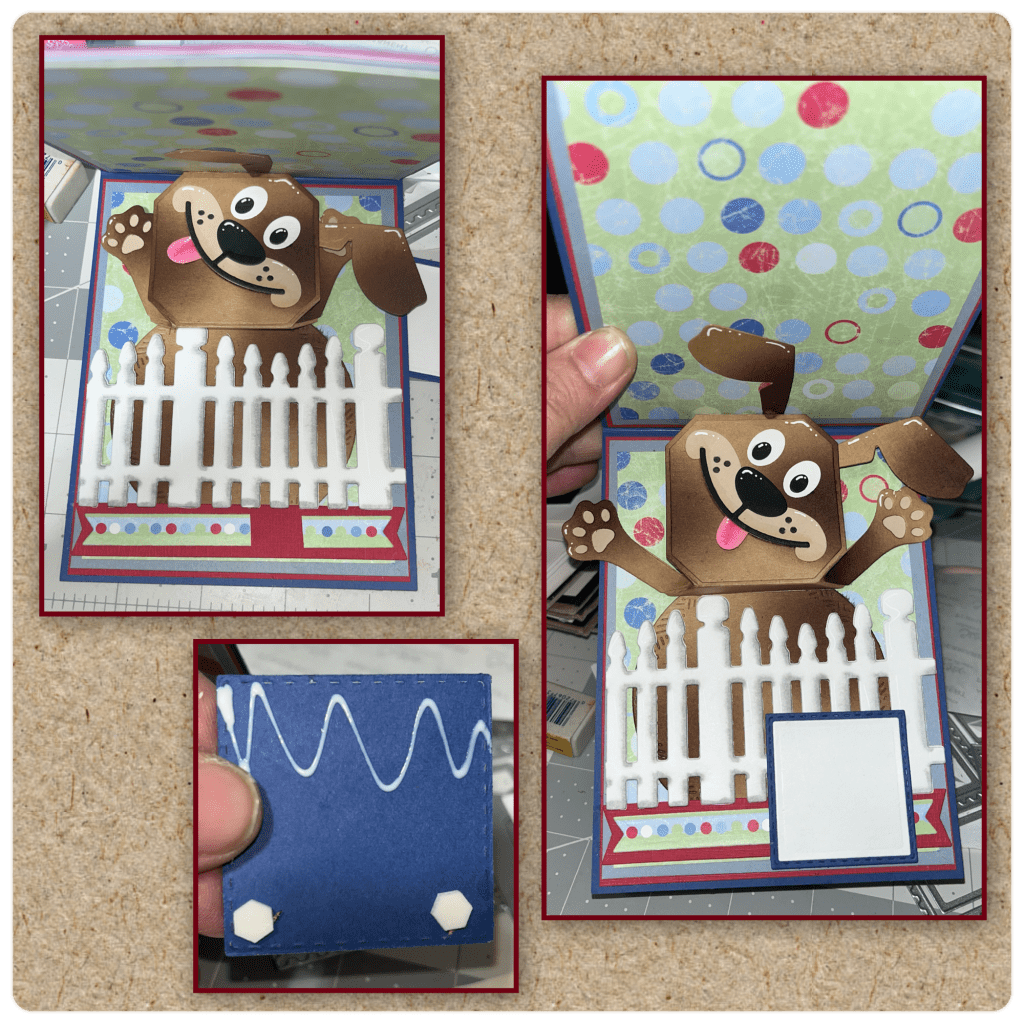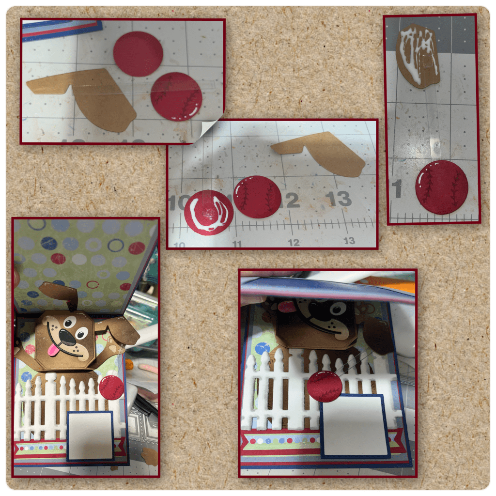 I thought that it would be really cute to add a ball and have it also have some motion. I was going to add it to the right side paw but it wasn’t going to move the way that I wanted it to, so I decided to add it to the ear. I cut out 2 balls from the Sports Charms, another right side ear and a stiff piece of clear plastic (I’m pretty sure the plastic from an old package) Sandwich the plastic between the 2 balls. I used a glue dot to adhere the plastic but liquid glue where the cardstock will glue to cardstock. Add the other end of the plastic to the ear as shown then attached this ear to the back of the ear on the dog so the plastic is sandwiched between the 2 pieces. The ball will move from side to side as you open and close the door.