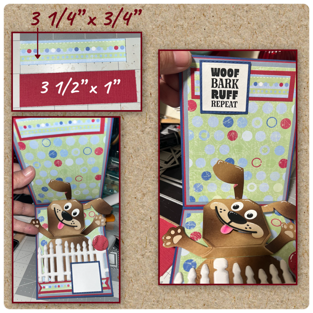 I wanted a bit of a border on the top so I cut out the pieces as shown with a square that is the exact same as the square at the bottom of the inside. I stamped the greeting from the Dog Sayings Clear Stamps. And added the pieces as shown.