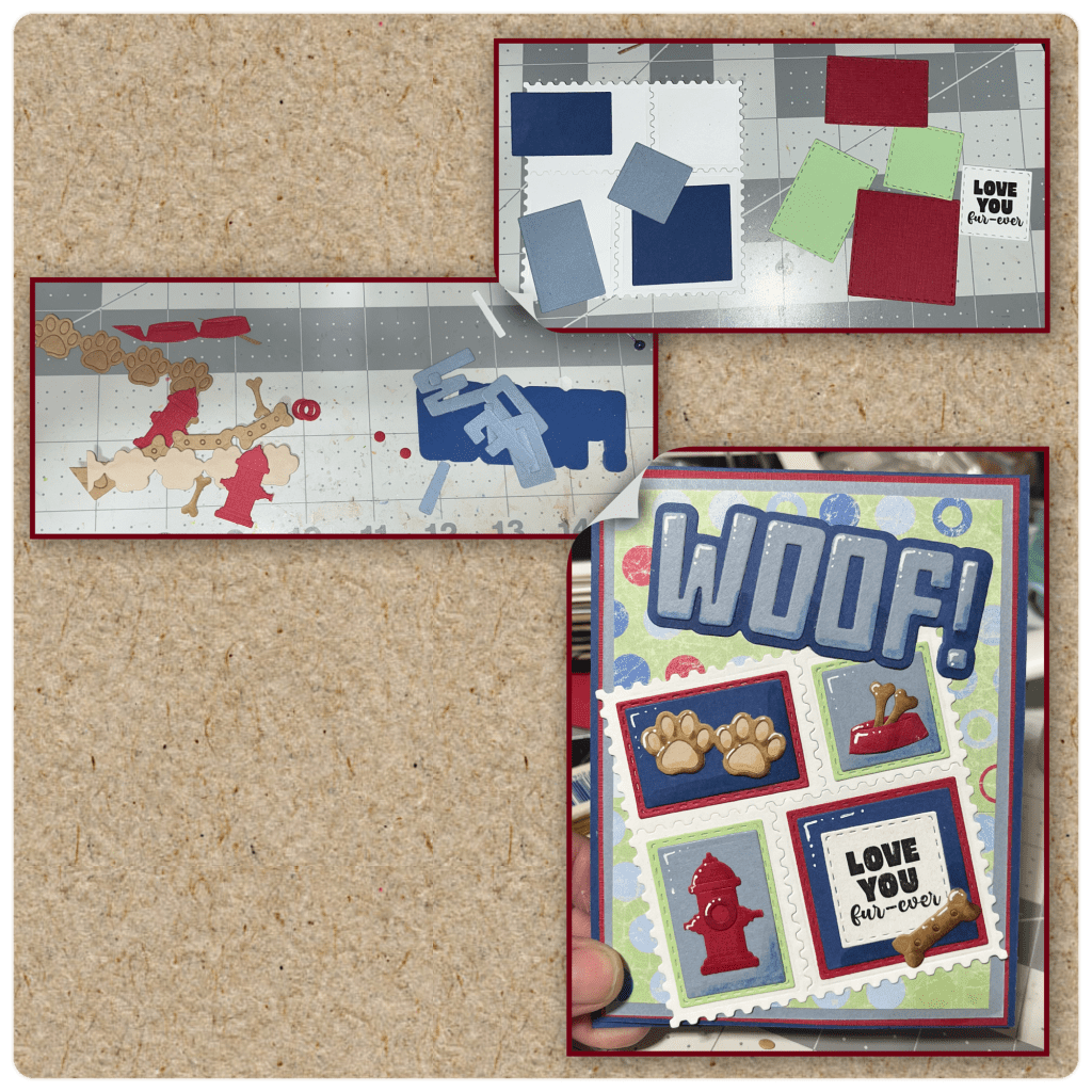 Now for the front…. I cut out the pieces from the Postage pop up (white square with blue layers), and Greeting Labels (red, green and white stamped piece).The dog pieces are form the Dog Borders, and WOOF! I assembles the pieces and added shading with alcohol markers, and highlighted with a white Gelly Roll Pen and assembled as shown.