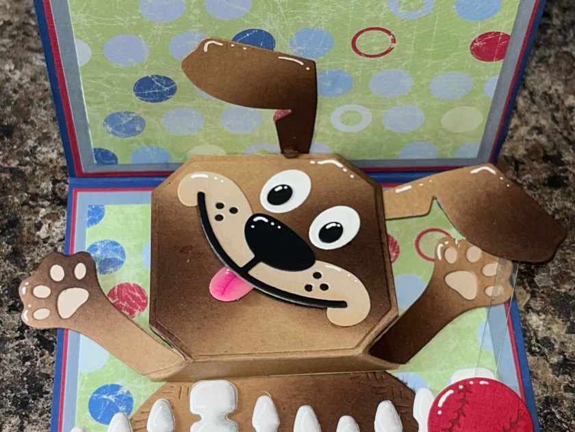 I thought that it would be really cute to add a ball and have it also have some motion. I was going to add it to the right side paw but it wasn’t going to move the way that I wanted it to, so I decided to add it to the ear. I cut out 2 balls from the Sports Charms, another right side ear and a stiff piece of clear plastic (I’m pretty sure the plastic from an old package) Sandwich the plastic between the 2 balls. I used a glue dot to adhere the plastic but liquid glue where the cardstock will glue to cardstock. Add the other end of the plastic to the ear as shown then attached this ear to the back of the ear on the dog so the plastic is sandwiched between the 2 pieces. The ball will move from side to side as you open and close the door.