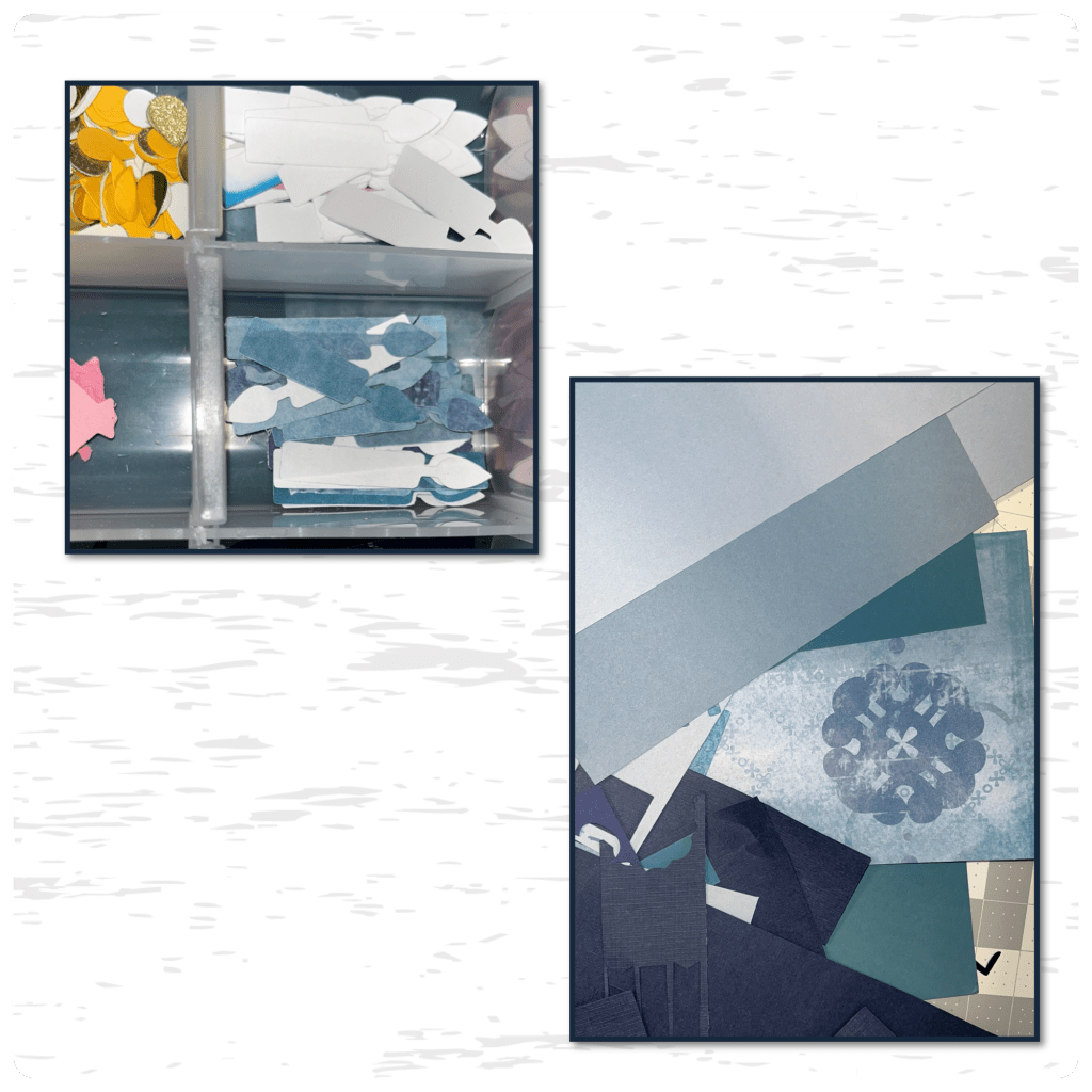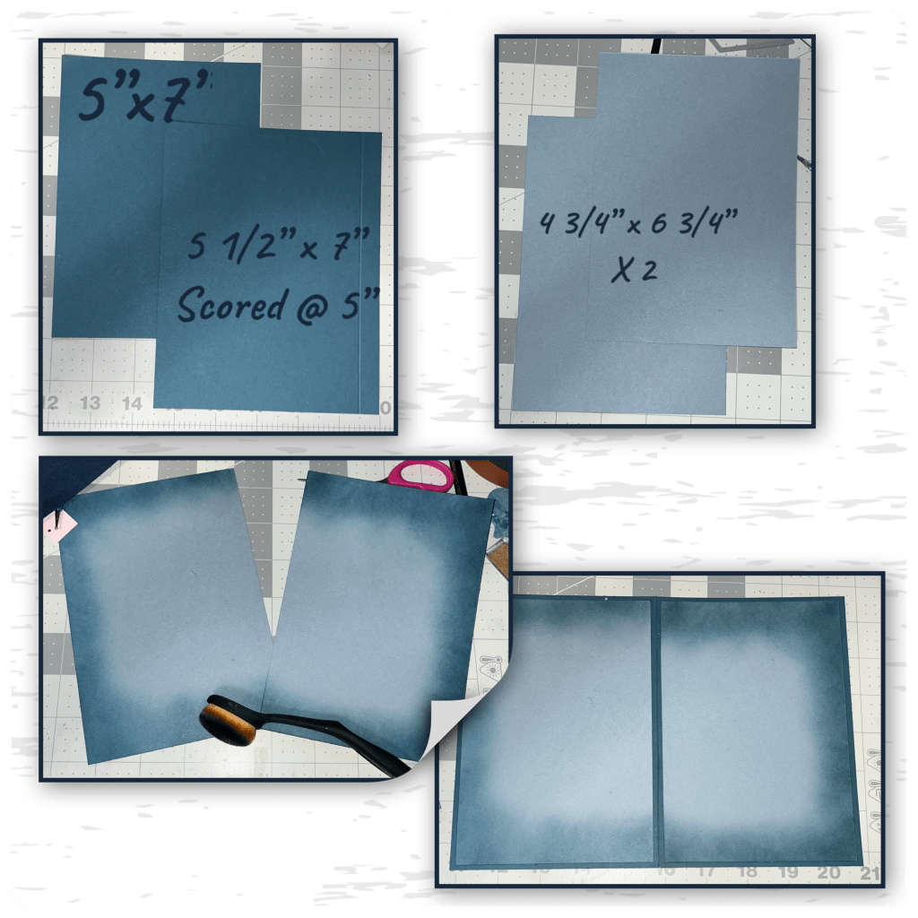 I thought it would be a good time to start the card base. I cut the panels as shown, I cut the base into 2 pieces and then attached them together. I brushed ink around the lighter blue piece and added as shown. I actually cut 3 of the lighter blue panel not 2.