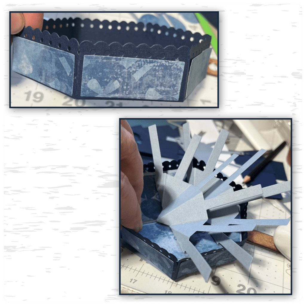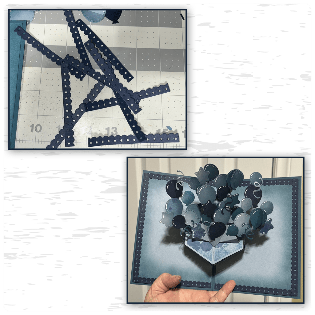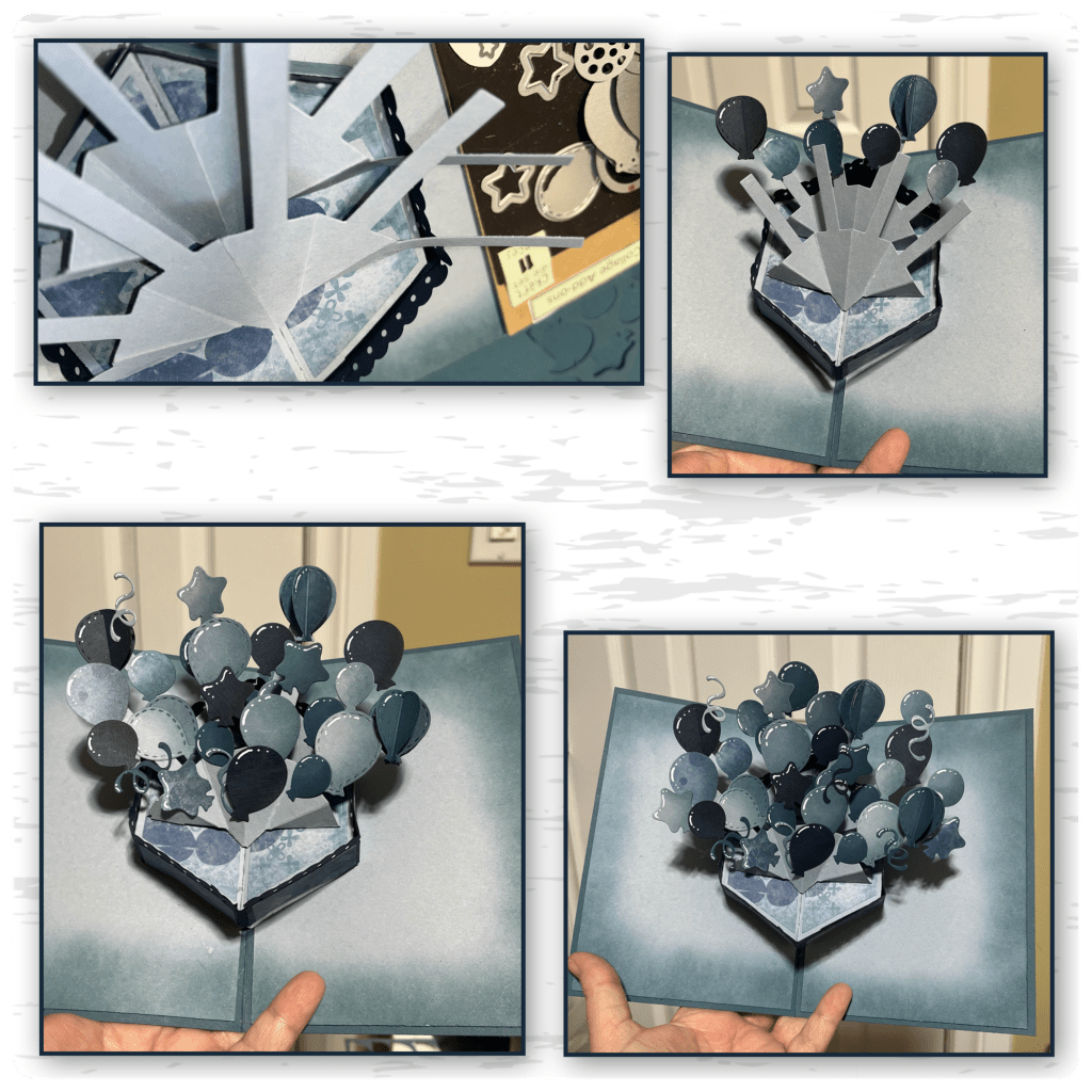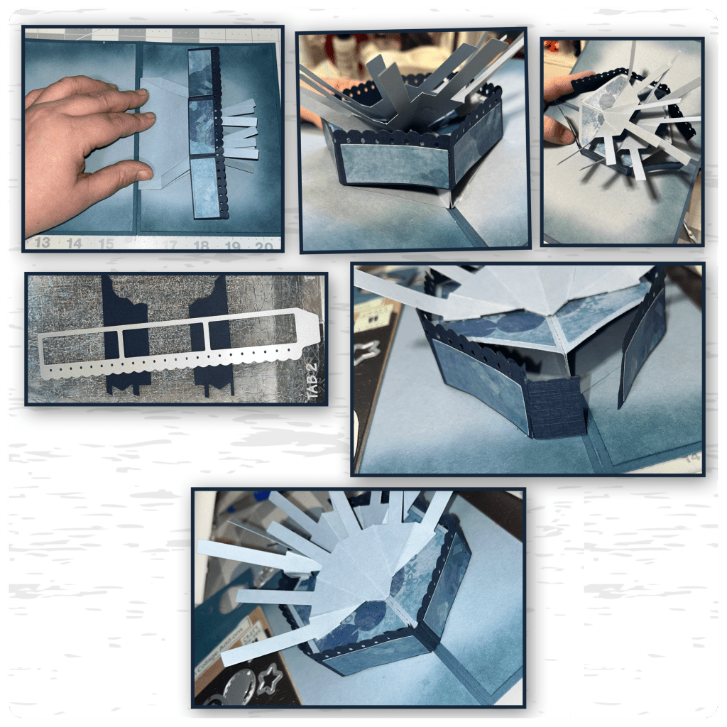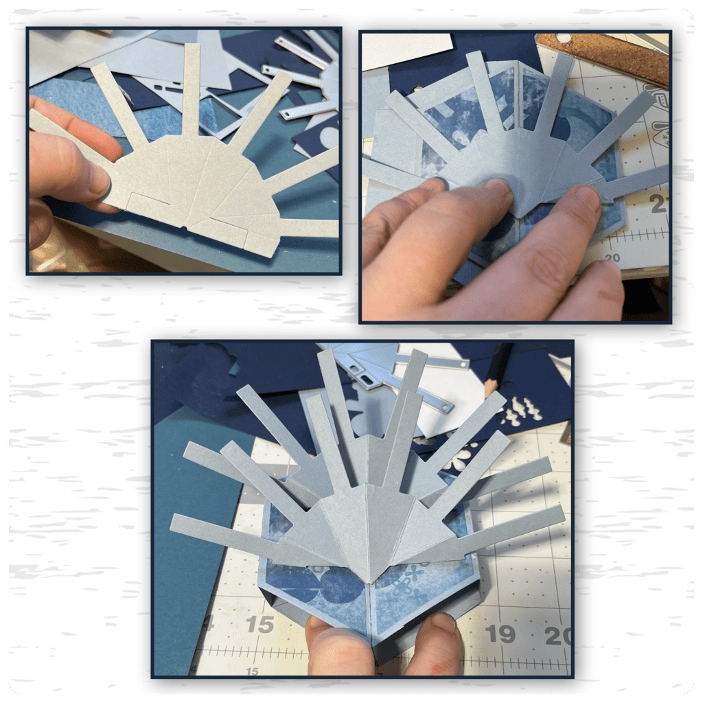 I cut out the mechanism from the Photo Fan Pop Up and checked to see it would fit and it did, then I realized that I was able to fit 2 so I cut and assembled a second one, I added them to the Stage the same way I would attach it to a card. (Karen has a video tutorial on the product page at the link ⬆️ )