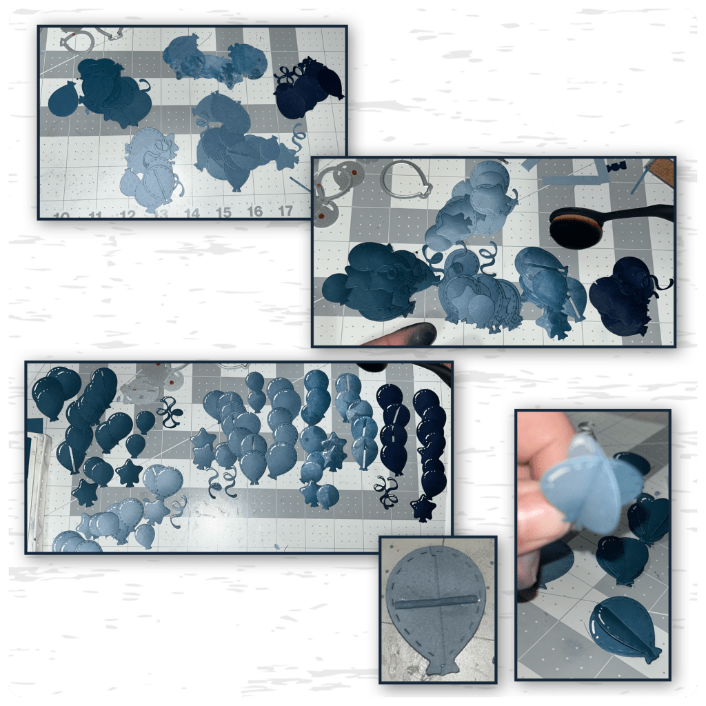 I die cute several balloons from the Balloon Collage Add On and the Party Balloons die sets. I used a brush to add on ink to the lower right side of the balloons, then added white Jelly Roll Pen highlights. I like the look of the layered balloons but sometimes they jam things up, so I add a small piece of cardstock (the piece that falls out the middle of the balloons) and glue it to the back. There is still dimension but it stays in position.