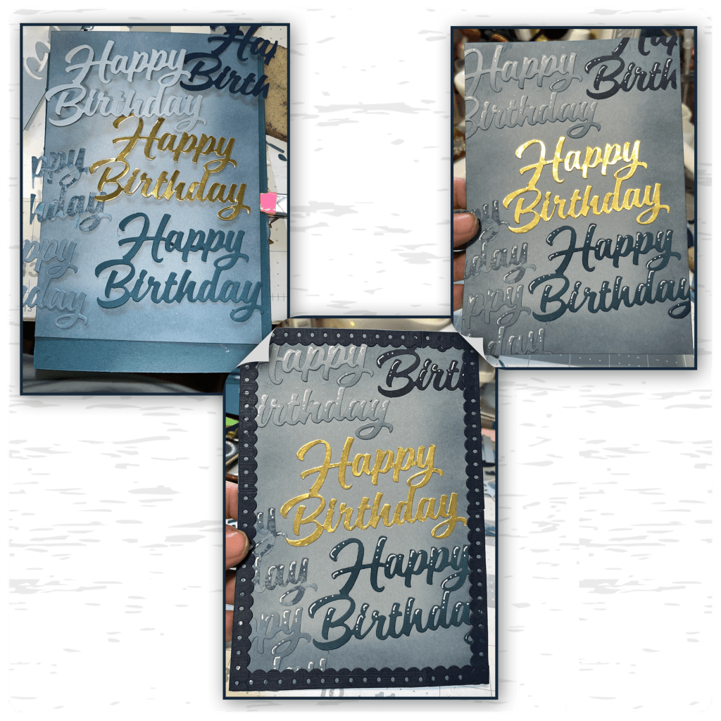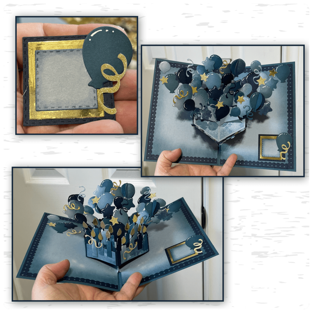 I thought that I needed a little bit more gold to work with the gold from the candle flames, so I cut some stars and streamers (from the Balloon Collage Add on) and a gold frame. To make the frame I cut the 2 blues using dies from the Greetings Add on and the gold frame was cut using a die from the Postage Add On.