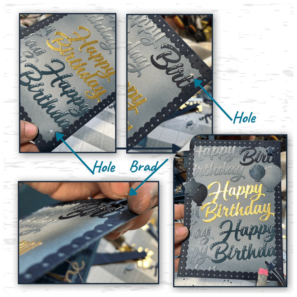 I wanted to use the Happy Birthday in a unique way so I cut it out from all the different blues and the gold and laid it out to cover the front of the panel. I added shading and highlights the same as the balloons then adhered to the panel, and trimmed off the edges. I added matching blue trim.
