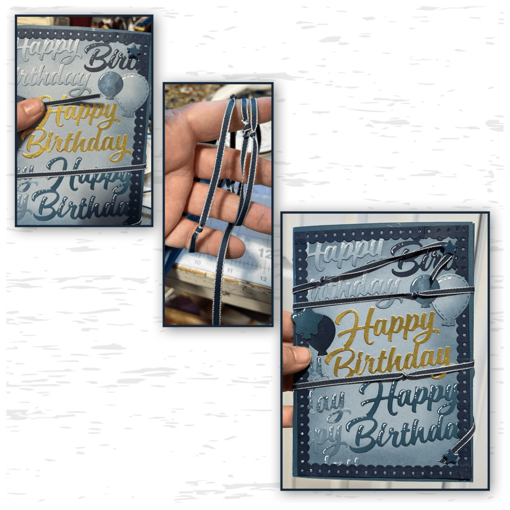 I added the panel to the card front and realized that I didn’t have enough string to wrap around to meet the top brad so i tied another piece to make it longer. I wanted it to look like the knot was a creative decision so I added several more. Then wrapped the string around from the bottom brad to the top brad.