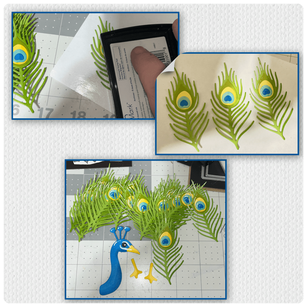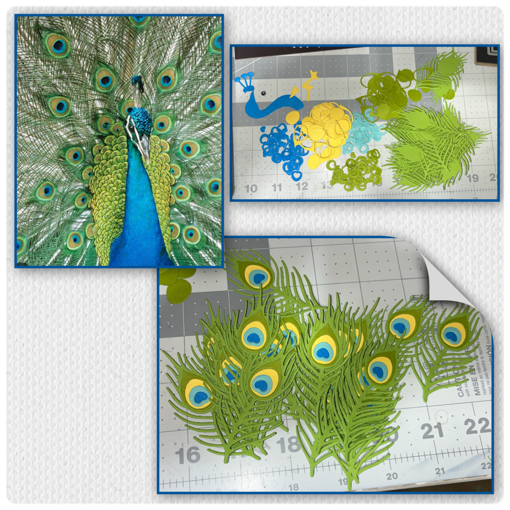 When making this peacock I decided to use a photo as colour reference, then die-cut the peacock pieces as shown below, and assembled the feathers.