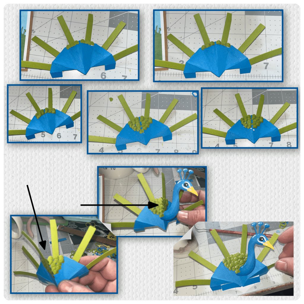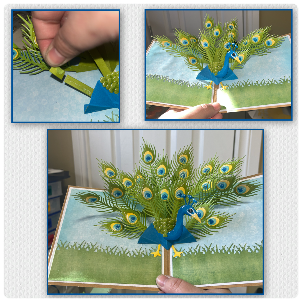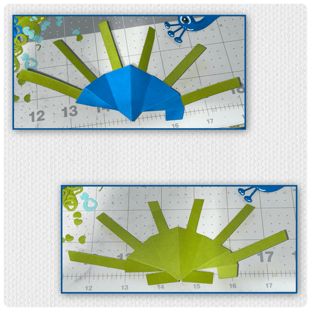 I used the Photo Fan pop-up to make the body. I wanted a blue body, but I didn’t want the blue arms to be visible behind the green feathers do I die-cut green arms and replaced the blue with the green. Later I realized I couldn’t use all the arms so I removed the lowest arm on both sides.