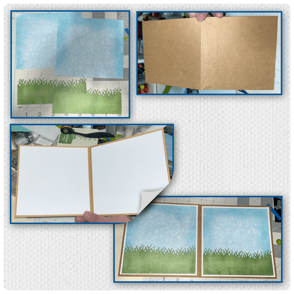 I used a blue ink pad and a brush to add ink to the edges of both blue pieces. I diecut the grass by using the Grass die from the Long Nature Edges, then used green ink and a brush to ink the edges. I used a white gel pen to highlight the blades of grass. I assembled the card base and added the layers as shown below.