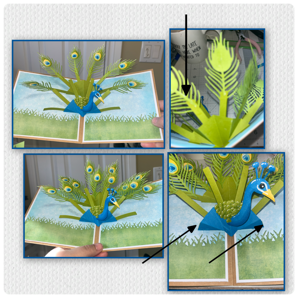 I started adding the feathers to the back row. I noticed that some of the feathers were flopping forward so I cut and added little strips of green to the back of the feathers to add strength. Sorry the photo doesn’t show as well as I’d like. I added more feathers along the back to fill in some of the space. I opened and closed the card after each feather to make sure that the feathers weren’t catching on each other and that they stay within the limits of the card when closed and that nothing was peaking out. This is also where I decided that I was going to remove the two bottom arms as shown.