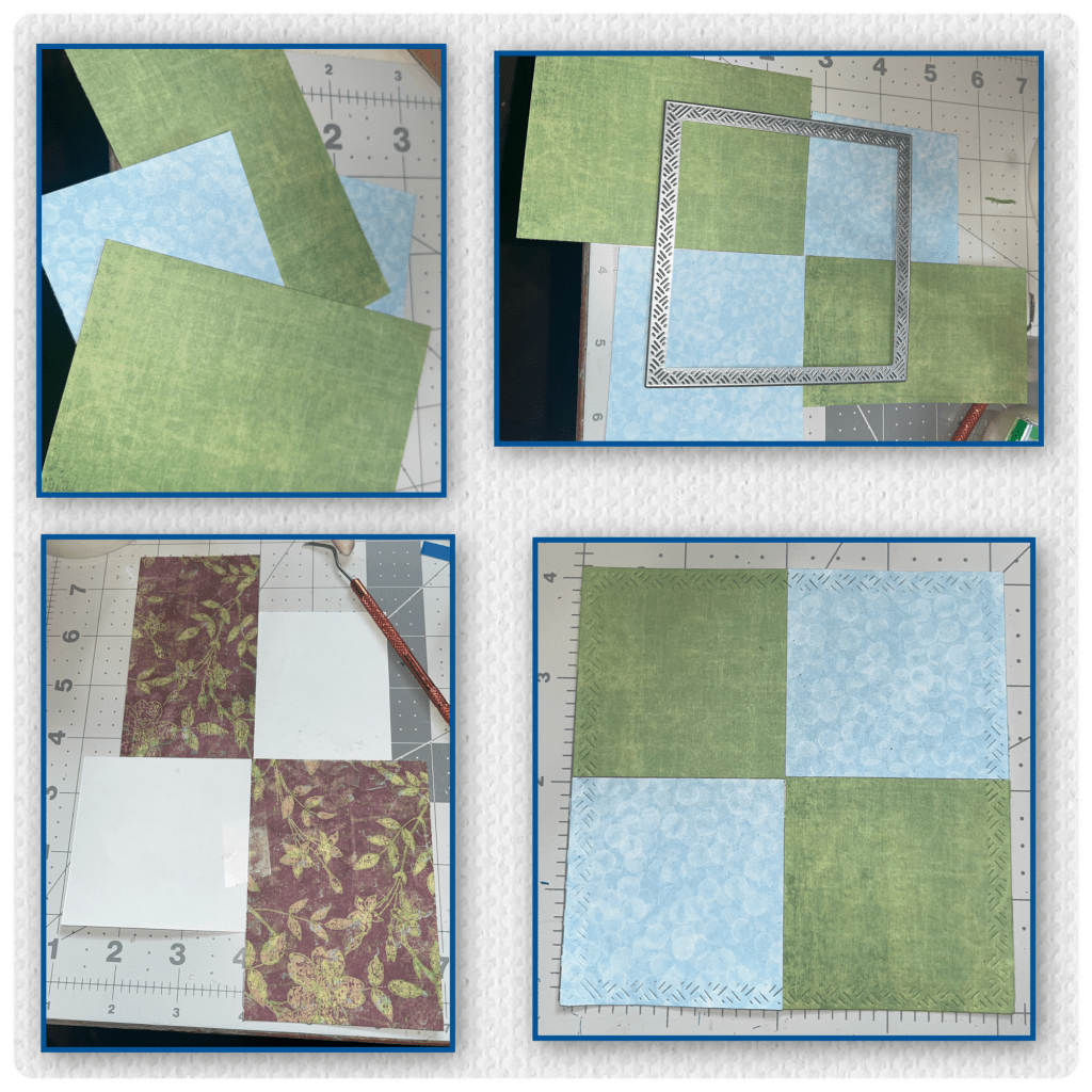 Time to start the front. I had a few scraps so I laid them out to ensure the largest square from the Squares Crosshatch would fit. I taped them together on the back then die cut.