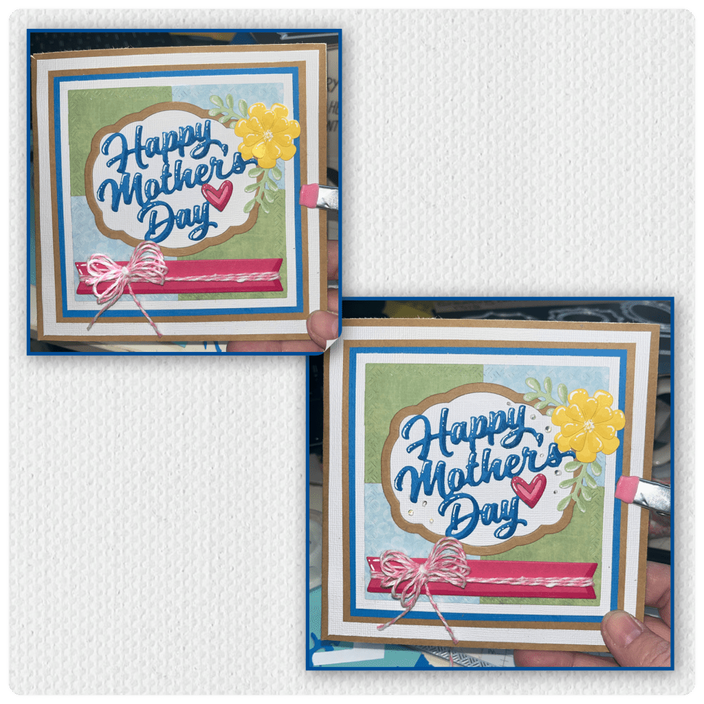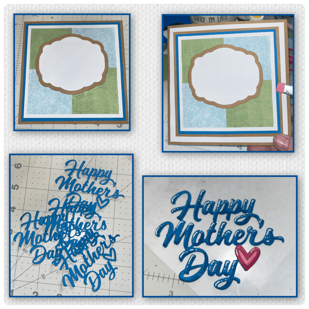 I layered the panels and the labels as shown and then added them to the card front. I diecut Happy Mother’s Day 4 times. I layered them together to add a bit of dimension, and added shading and highlights.