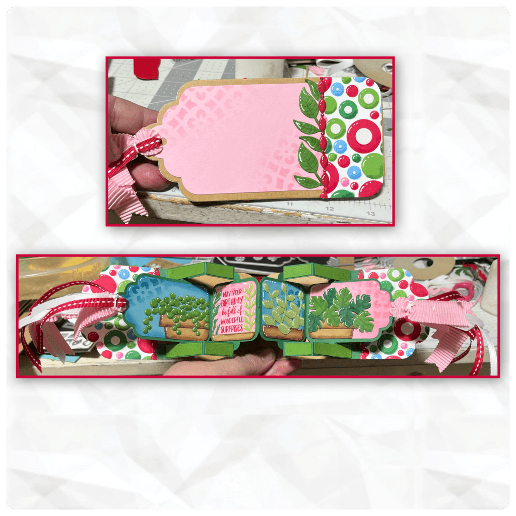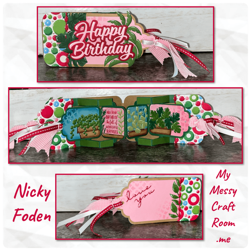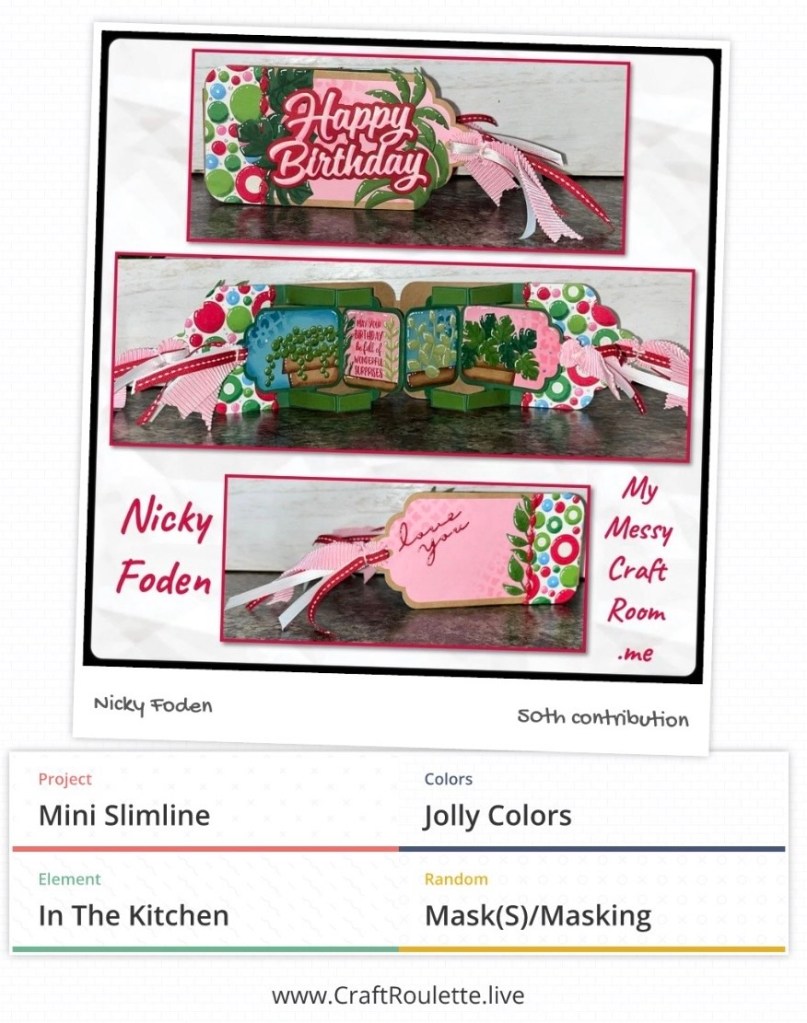 …. And this is how I met them. It is a min slimline, I think of Jolly colours as Christmas colours so I grabbed a piece of Christmas paper that wasn’t too Christmasy and used colours in the paper. In my kitchen I have several house plants, and I masked with a stencil on the front, back and on the tags.