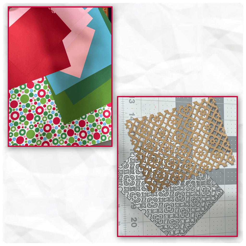 Here is the paper I pulled from my stash, and the cardstock colours to match. I don’t really have a lot of stencils so I made one using Pattern Plate- Tile and a pretty thick cardstock.