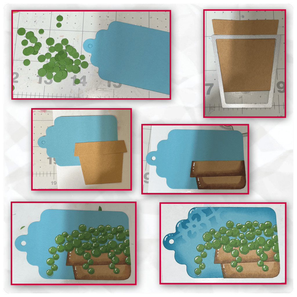 I wasn’t sure what I was exactly going to do so I thought I would make the tags first to see if I liked how they turned out. I cut out the tag from the Tagbook pop up, and several little circles (from Woven Basket & Fun Flowers) from green. Using a die from the Flower Pot pop up I cut the pot and using the same die I cut the pot as shown. I flipped the top piece over to make a small flower pot. I added it to the tag, and trimmed it as shown. I added shading with an alcohol marker and highlights with a white gelly roll pen. I added the circles to make it look like my String of Pearls plant. I added shading and highlights. Using a blending brush and my stencil I added the pattern to the top left as shown. If I were doing this again I would have done this step first (I did this on the other 3 tags)