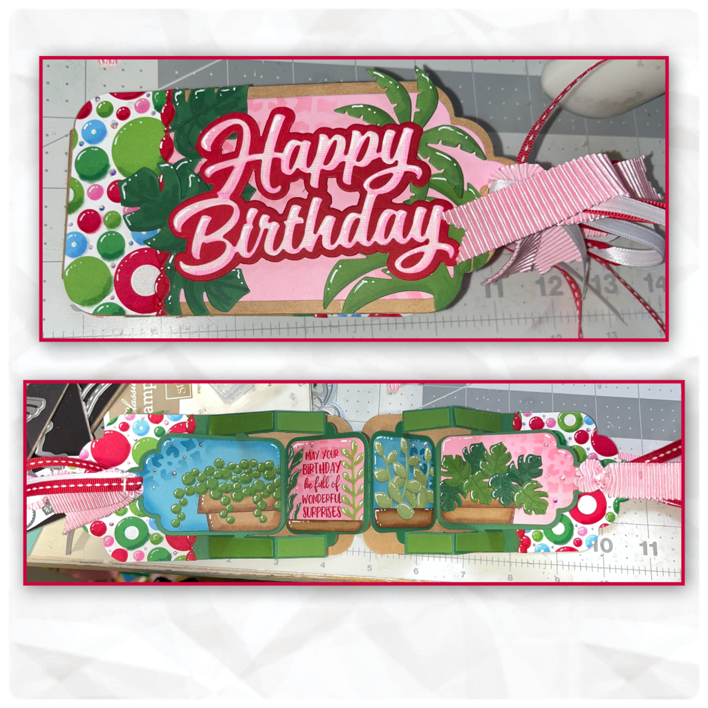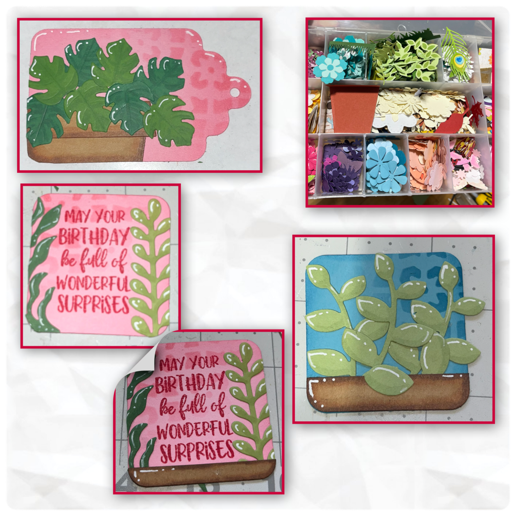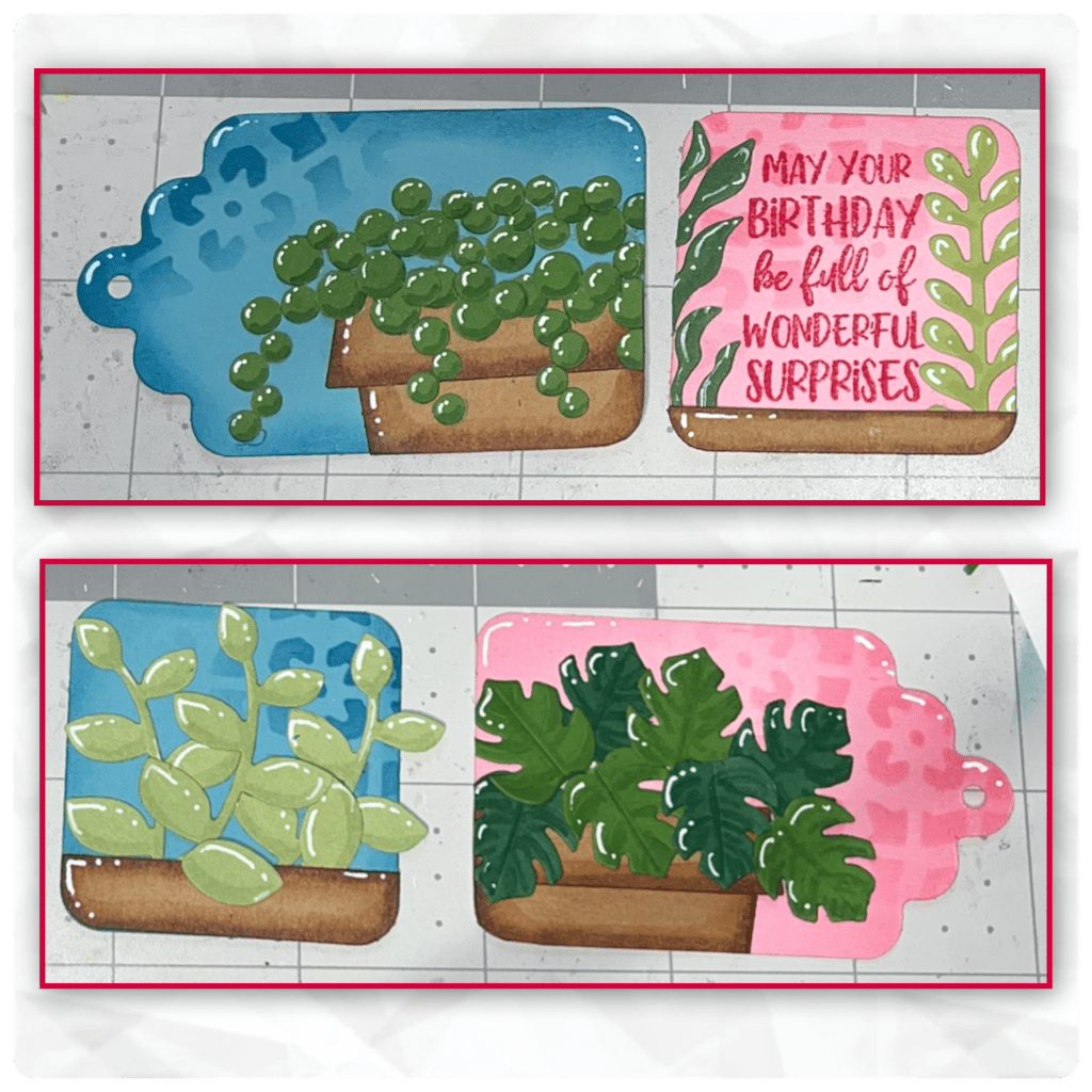 So I basically did the same steps to create the other tags. The leaves on the large pink tag are from the Landscape Scene I have a container with extra diecuts so I pulled a few from there as well (Flower Pot Add ons, Garden Charms and Autumn Elements). I stamped the birthday greeting from Stage Scenes Clear Stamps before adding the diecuts. I added the brown piece along the bottom to resemble the plants being in a pot.