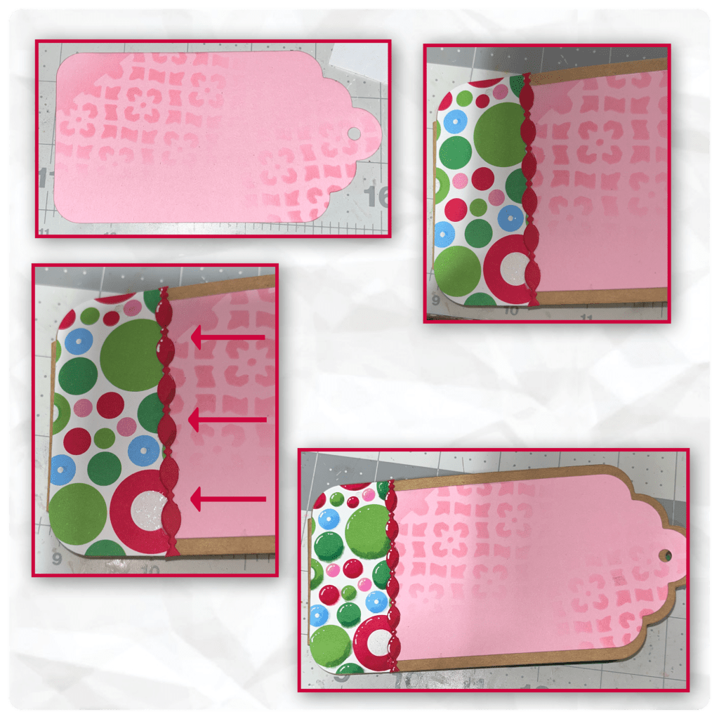 I thought that I would switch gears for a bit and start working on the front. From the Topper Tags set and used the die that is 1 size smaller than the card base. I used the stencil the same as before then added it to the card. NOTE if you want there to be an evenish frame around the pink tag then the holes will not line up properly. Using the large tag die (from the Tag Book Pop Up set) I cut the patterned paper to make a border. I added a red trim from the Border Blends-Party. I really like the look of adding shading and highlights to the trim. To show the difference, you can see in the photo with the arrows that the bottom 2 sections have nothing added, the middle 2 just have shading, and the top 2 have shading and highlights. I also have fun adding shading and highlights to the patterned paper, the ink bled a bit but I think it gives kind of a water colour look.