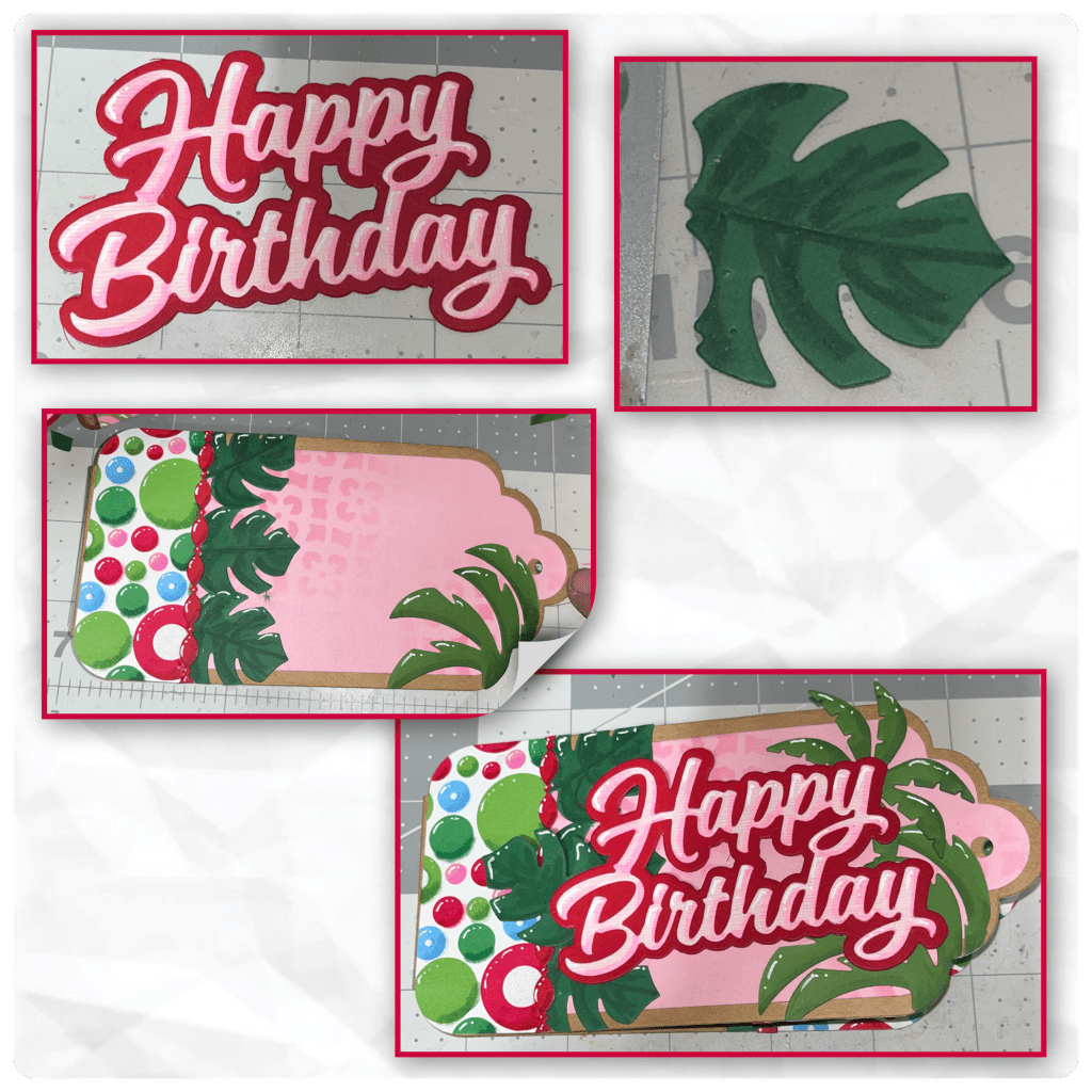 I cut out the Happy Birthday and Happy Birthday Shadow and added Alcohol Marker shading and white gel pen highlights. When I cut the leaves from the Landscape Scene I realized that I should have added the leaves under the border. To get it to look like it was under the border I used the border die to cut the sides out of the leaves, then added to the card. I used the Palm trees from the Palm Tree Pop up. I used foam adhesive to add the Happy Birthday.