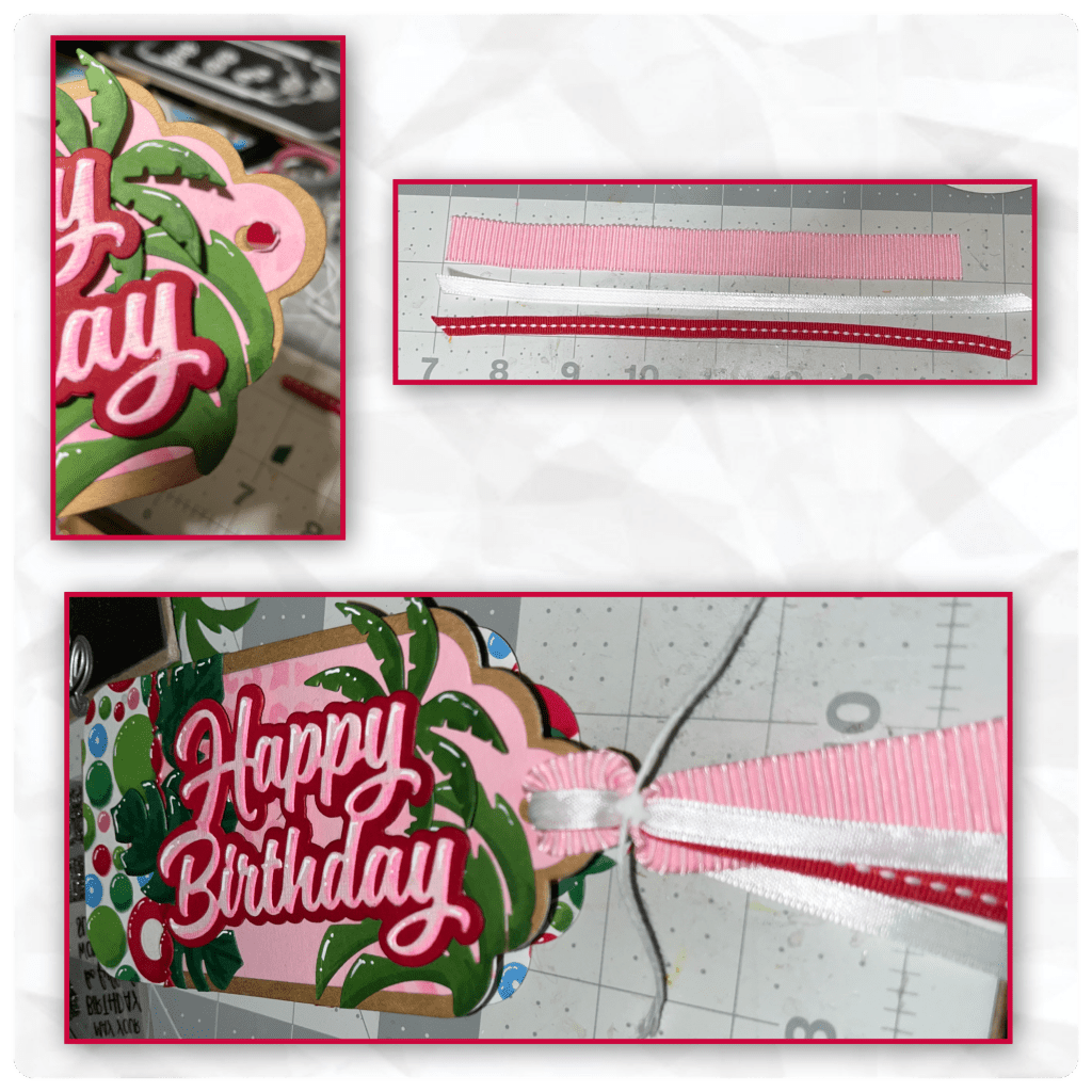 I wanted to add ribbon to the card so I cut roughly 8” of each. I used a pointy tool to make the hole bigger before adding the ribbon. I just pulled the ribbon through and then tied it with a small piece of bakers twine. I did this for the front and the back. For the inside tags I cut the ribbon about 2” shorter, then did the same. I trimmed the ends once I was finished.
