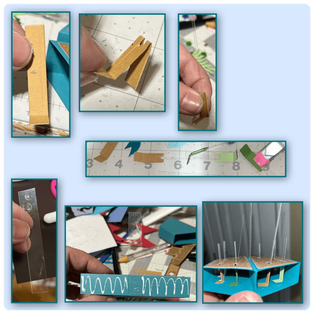 I wanted to use clear sticks (cut up plastic packaging) to mount my elements so I had to come up with a way yo attached them to the stage pieces. I took the pieces that are meant to use and folded them as shown. I cut a little notch in then top and glued the stick inside the hole, use a dry adhesive like glue dots. I added one strip in between the stage pieces and adhered together then added all the little tab pieces.