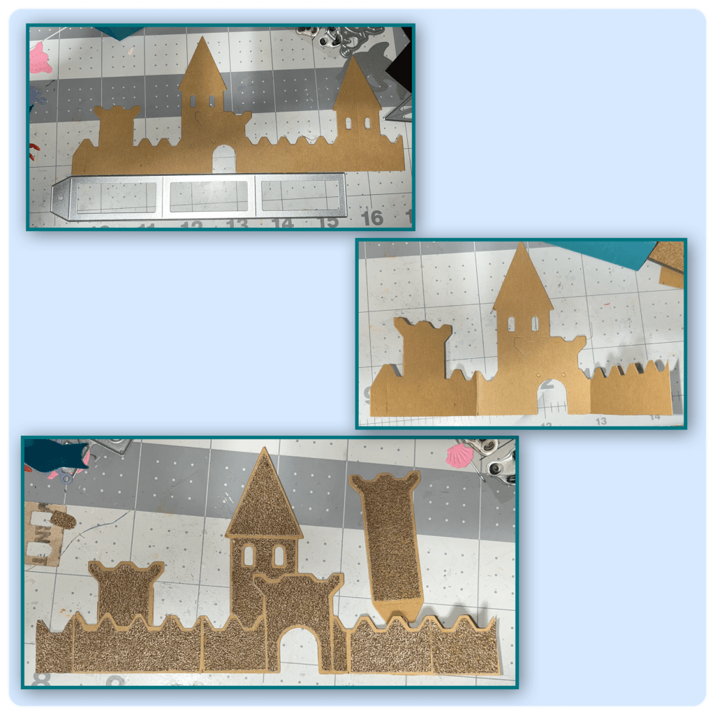 I cut out and assembled these pieces of the Castle Pop up. I used the sand paper to add the sandy detail.