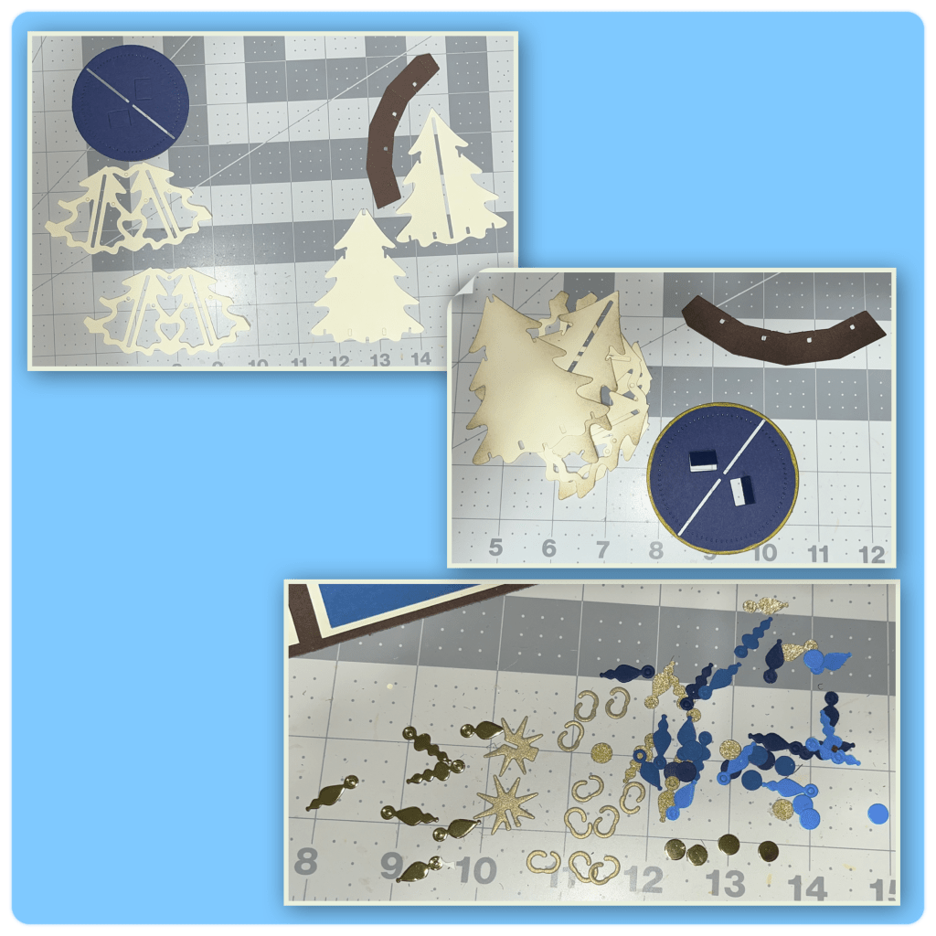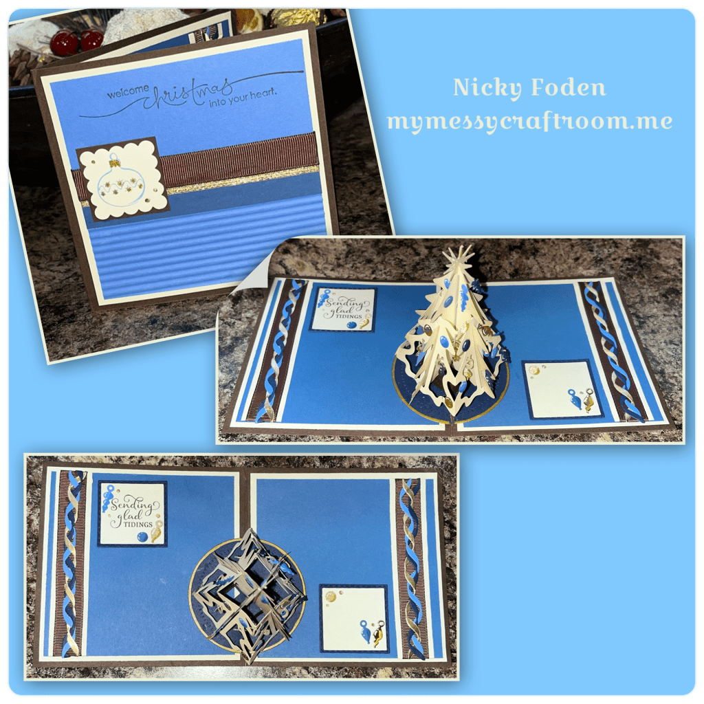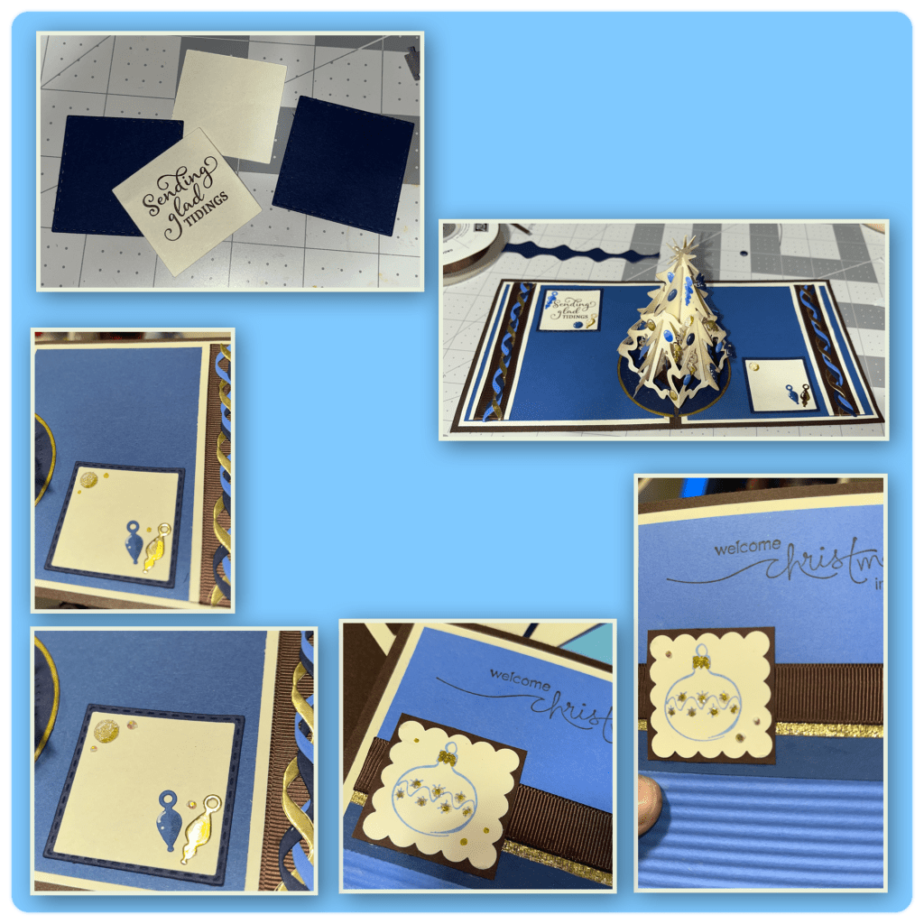 Now for the inside, I cut out the pieces for the Christmas Tree Pop Up, and the Christmas Tree Add on (Karen has a video tutorials on the product page at the links ⬆️ ) I brush a brown ink around the edges of the tree. I used a gold marker and outlined the dark blue tree skirt and added highlights and shading to the ornaments (sorry I forgot to take a pic)