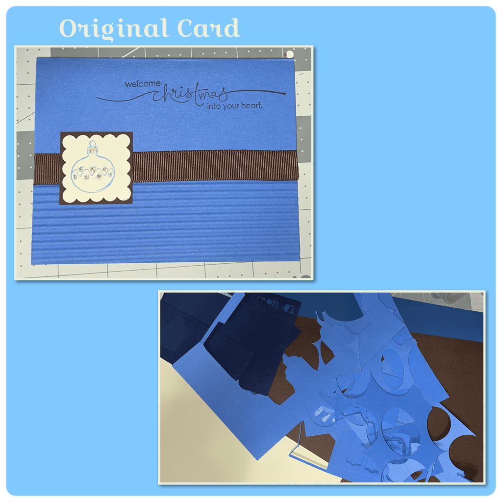 Now to rework the front of the card. I was able to pop off the stamped square and the ribbon and cut the card front in half. FYI I originally used a Fiscars Paper Crimper to crimp the bottom half of the card front. The stamps are all retired Stampin Up.