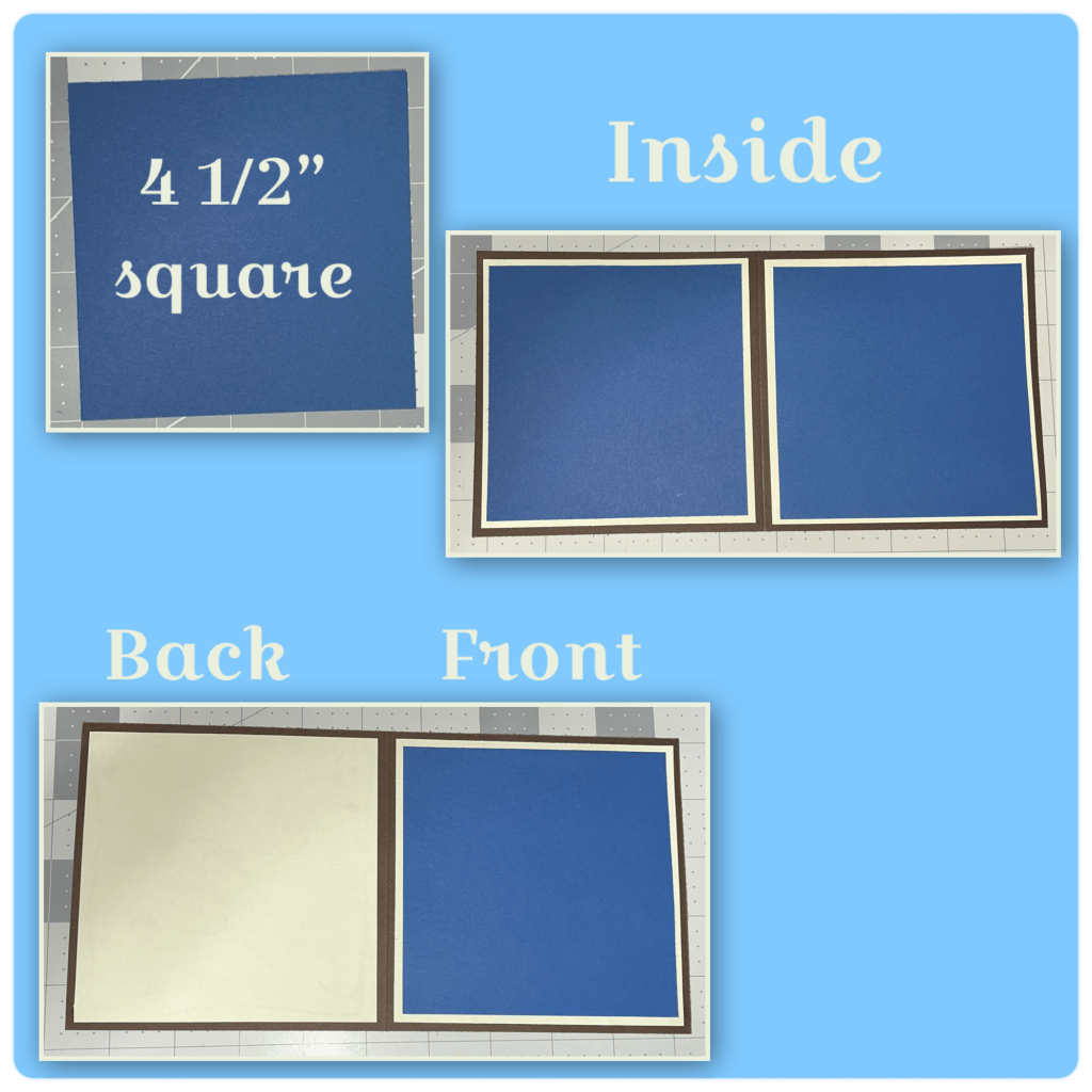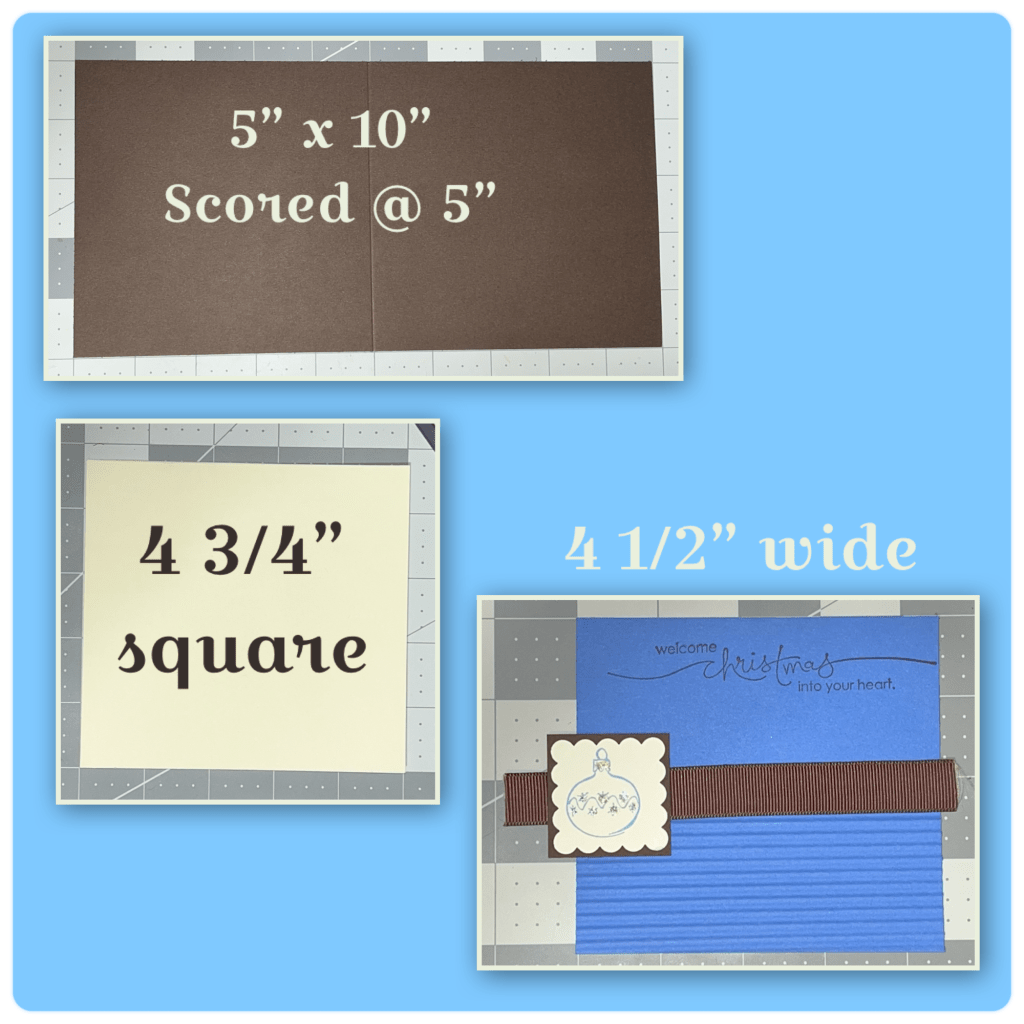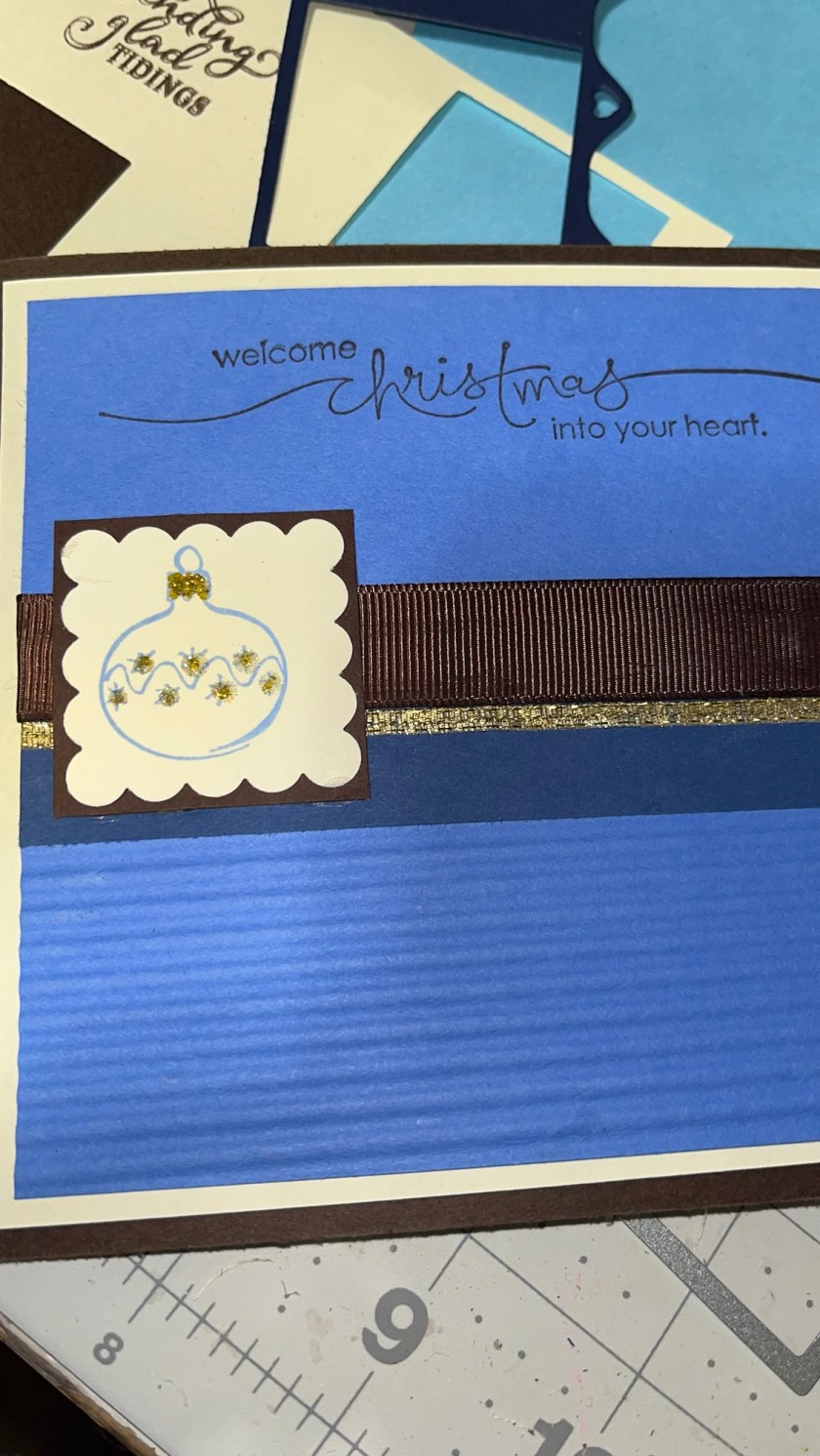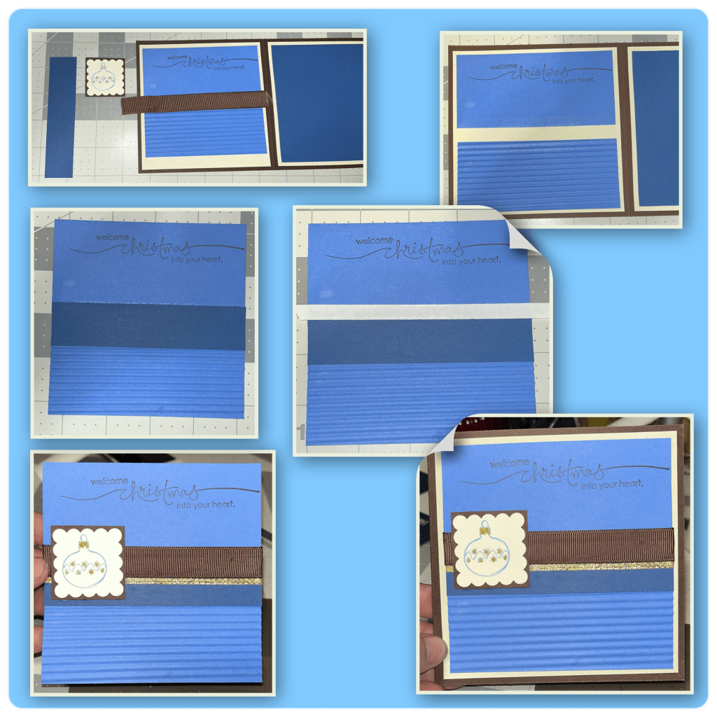 I spaced out the 2 halves then added a darker blue strip that is 4 1/2” x 1”. I reattached the brown ribbon and decided to also add a very thin gold ribbon. I glued the stamped image back into place.